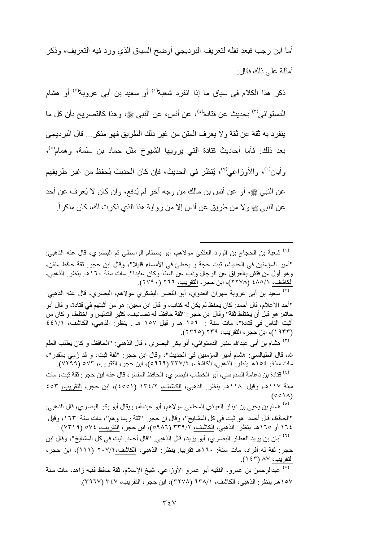 (¬3) هشام بن أبى عبدالله سنبر الدستوائي، أبو بكر البصري، قال الذهبي: "الحافظ، وكان يطلب العلم لله، قال الطيالسي: هشام أمير المؤمنين في الحديث"، وقال ابن حجر: "ثقة ثبت، وقد رُمِي بالقدر"، مات سنة: 154 هـ ينظر: الذهبي، الكاشف، 2/ 337 (5969)، ابن حجر، التقريب، 573 (7299).