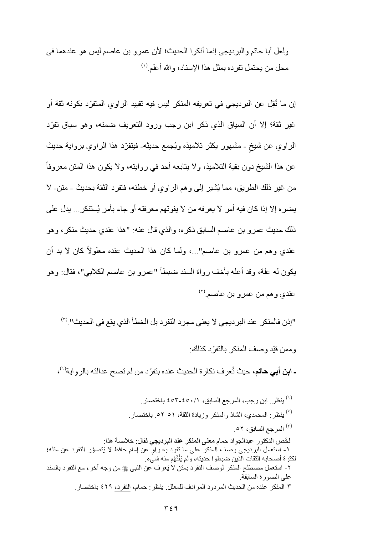 إن ما نُقِل عن البرديجي في تعريفه المنكر ليس فيه تقييد الراوي المتفرّد بكونه ثقة أو غير ثقة؛ إلا أن السياق الذي ذكر ابن رجب ورود التعريف ضمنه، وهو سياق تفرّد الراوي عن شيخٍ - مشهور يكثر تلاميذه ويُجمع حديثه- فيتفرّد هذا الراوي برواية حديث عن هذا الشيخ دون بقية التلاميذ، ولا يتابعه أحد في روايته، ولا يكون هذا المتن معروفاً من غير ذلك الطريق، مما يُشير إلى وهم الراوي أو خطئه، فتفرد الثقة بحديث - متن- لا يضره إلا إذا كان فيه أمر لا يعرفه من لا يفوتهم معرفته أو جاء بأمر يُستنكر ... يدل على ذلك حديث عمرو بن عاصم السابق ذكره، والذي قال عنه: "هذا عندي حديث منكر، وهو عندي وهم من عمرو بن عاصم" ... ، ولما كان هذا الحديث عنده معلولاً كان لا بد أن يكون له علة، وقد أعله بأخف رواة السند ضبطاً "عمرو بن عاصم الكلابي"، فقال: وهو عندي وهم من عمرو بن عاصم. (¬2)