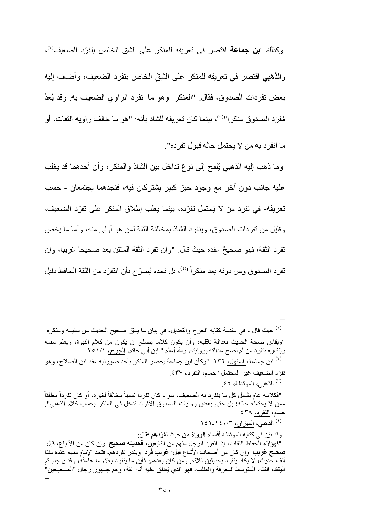(¬1) ابن جماعة، المنهل، 136. "وكأن ابن جماعة يحصر المنكر بأحد صورتيه عند ابن الصلاح، وهو تفرّد الضعيف غير المحتمل" حمام، التفرد، 437.