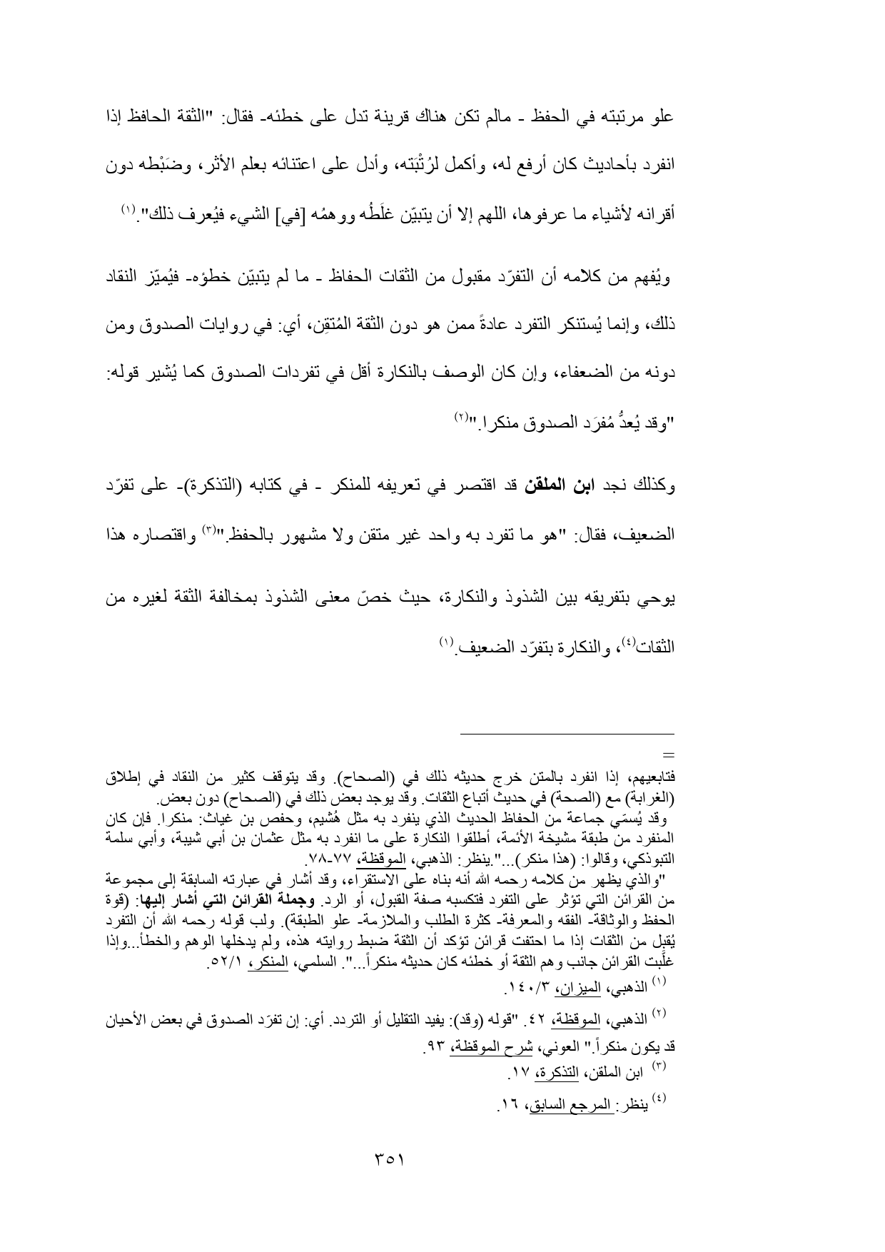 (¬2) الذهبي، الموقظة، 42. "قوله (وقد): يفيد التقليل أو التردد. أي: إن تفرّد الصدوق في بعض الأحيان قد يكون منكراً." العوني، شرح الموقظة، 93.