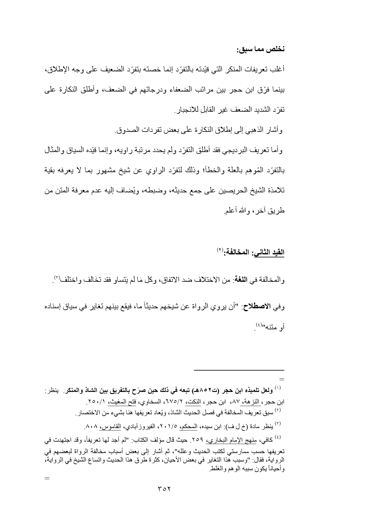(¬3) كافي، منهج الإمام البخاري، 259. حيث قال مؤلف الكتاب: "لم أجد لها تعريفاً، وقد اجتهدت في تعريفها حسب ممارستي لكتب الحديث وعلله"، ثم أشار إلى بعض أسباب مخالفة الرواة لبعضهم في الرواية، فقال: "وسبب هذا التغاير في بعض الأحيان، كثرة طرق هذا الحديث واتساع الشيخ في الرواية، وأحياناً يكون سببه الوهم والغلط.