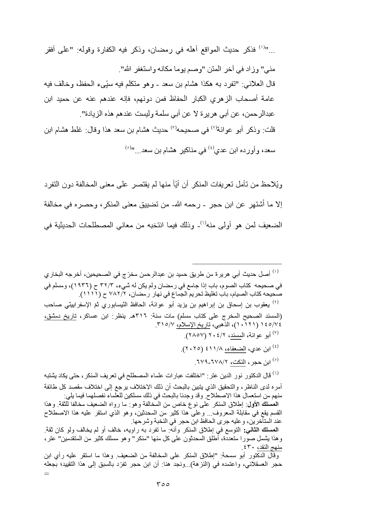 (¬6) قال الدكتور نور الدين عتر: "اختلفت عبارات علماء المصطلح في تعريف المنكر عتر، منهج النقد، 430.