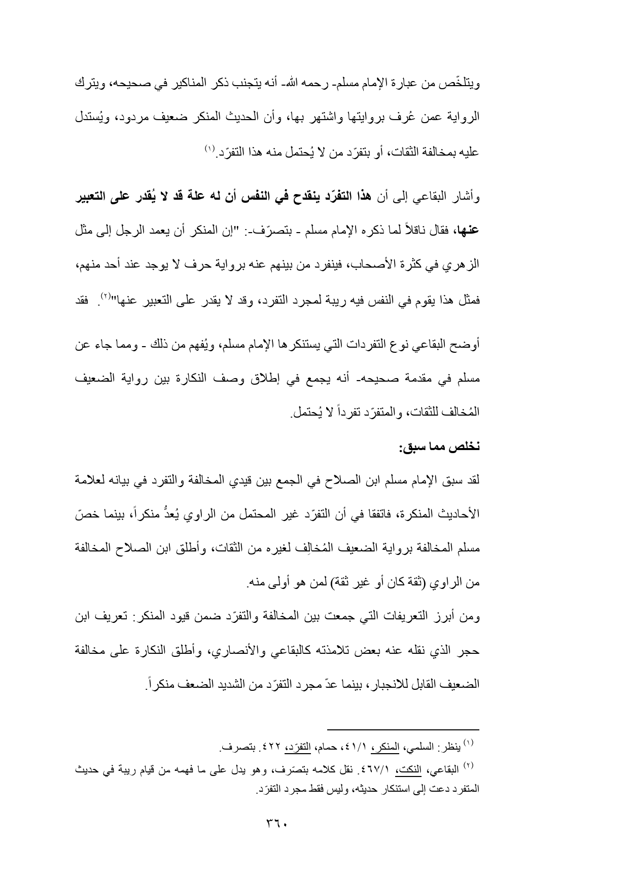 وأشار البقاعي إلى أن هذا التفرّد ينقدح في النفس أن له علة قد لا يُقدر على التعبير عنها، فقال ناقلاً لما ذكره الإمام مسلم - بتصرّف-: "إن المنكر أن يعمد الرجل إلى مثل الزهري في كثرة الأصحاب، فينفرد من بينهم عنه برواية حرف لا يوجد عند أحد منهم، فمثل هذا يقوم في النفس فيه ريبة لمجرد التفرد، وقد لا يقدر على التعبير عنها" (¬2). فقد أوضح البقاعي نوع التفردات التي يستنكرها الإمام مسلم، ويُفهم من ذلك - ومما جاء عن مسلم في مقدمة صحيحه- أنه يجمع في إطلاق وصف النكارة بين رواية الضعيف المُخالف للثقات، والمتفرّد تفرداً لا يُحتمل.