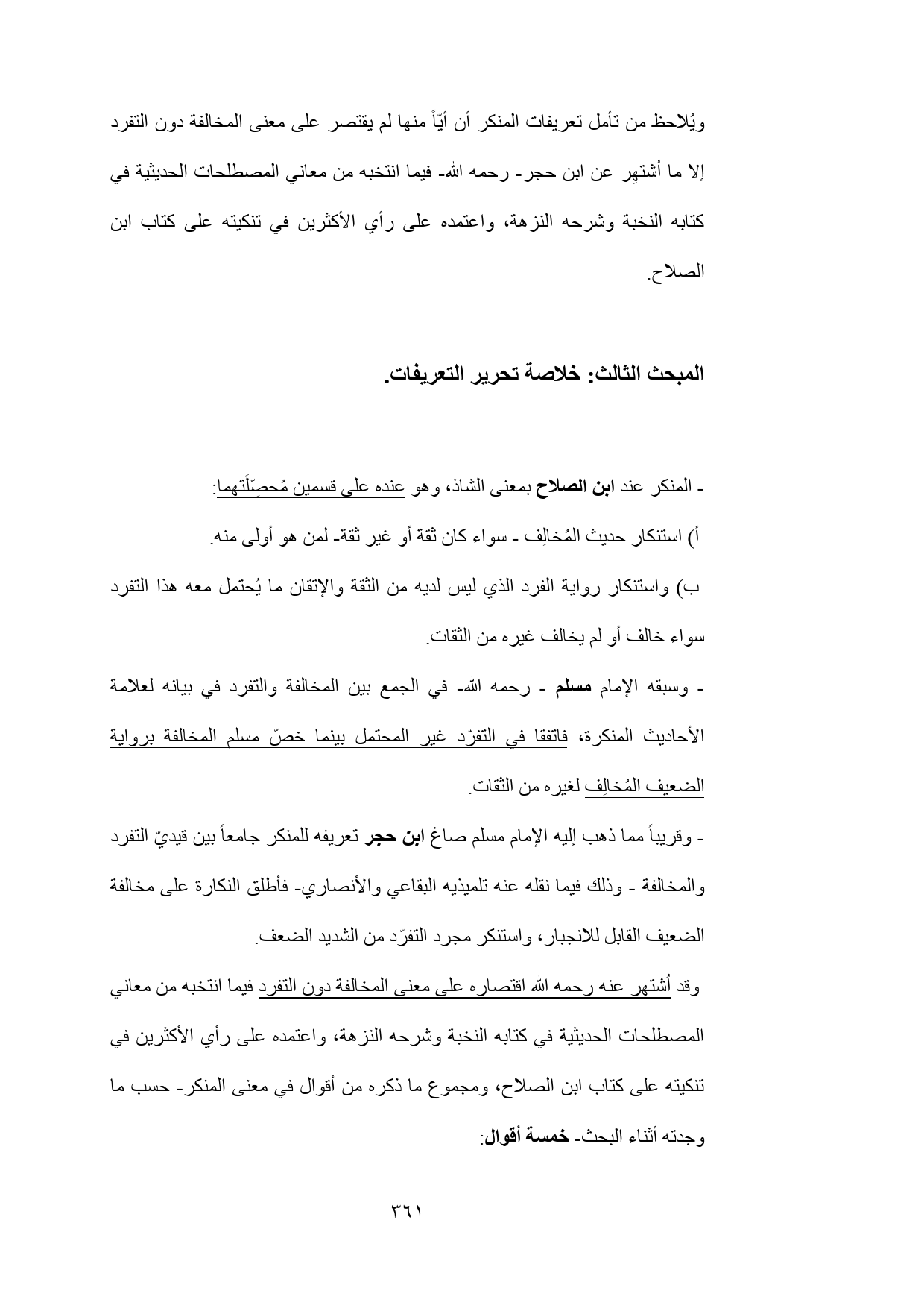 ويُلاحظ من تأمل تعريفات المنكر أن أيّاً منها لم يقتصر على معنى المخالفة دون التفرد إلا ما اُشتهِر عن ابن حجر- رحمه الله- فيما انتخبه من معاني المصطلحات الحديثية في كتابه النخبة وشرحه النزهة، واعتمده على رأي الأكثرين في تنكيته على كتاب ابن الصلاح.