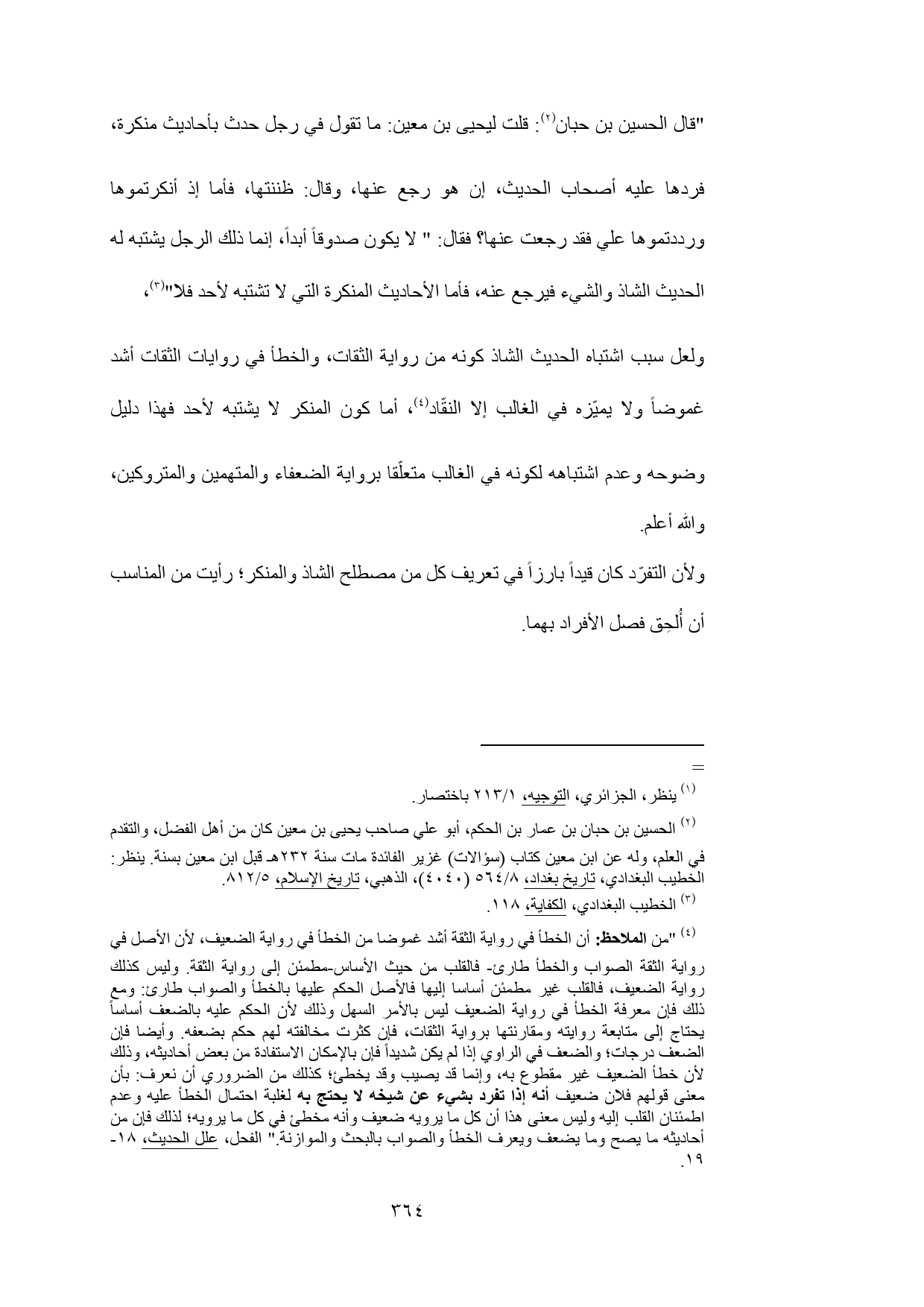 ولأن التفرّد كان قيداً بارزاً في تعريف كل من مصطلح الشاذ والمنكر؛ رأيت من المناسب أن أُلحِق فصل الأفراد بهما.