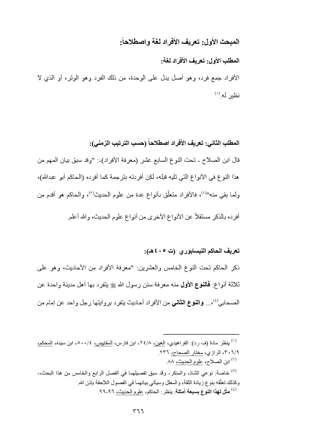 قال ابن الصلاح - تحت النوع السابع عشر (معرفة الأفراد) -: "وقد سبق بيان المهم من هذا النوع في الأنواع التي تليه قبله، لكن أفردته بترجمة كما أفرده (الحاكم أبو عبدالله)، ولما بقي منه" (¬2)، فالأفراد متعلّق بأنواع عدة من علوم الحديث (¬3)، والحاكم هو أقدم من أفرده بالذكر مستقلاً عن الأنواع الأخرى من أنواع علوم الحديث، والله أعلم.