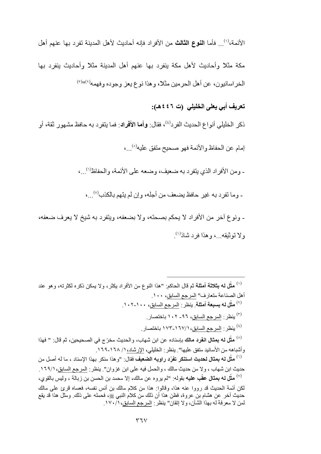 (¬1) مثّل له بثلاثة أمثلة ثم قال الحاكم: "هذا النوع من الأفراد يكثر، ولا يمكن ذكره لكثرته، وهو عند أهل الصناعة متعارف" المرجع السابق، 100.