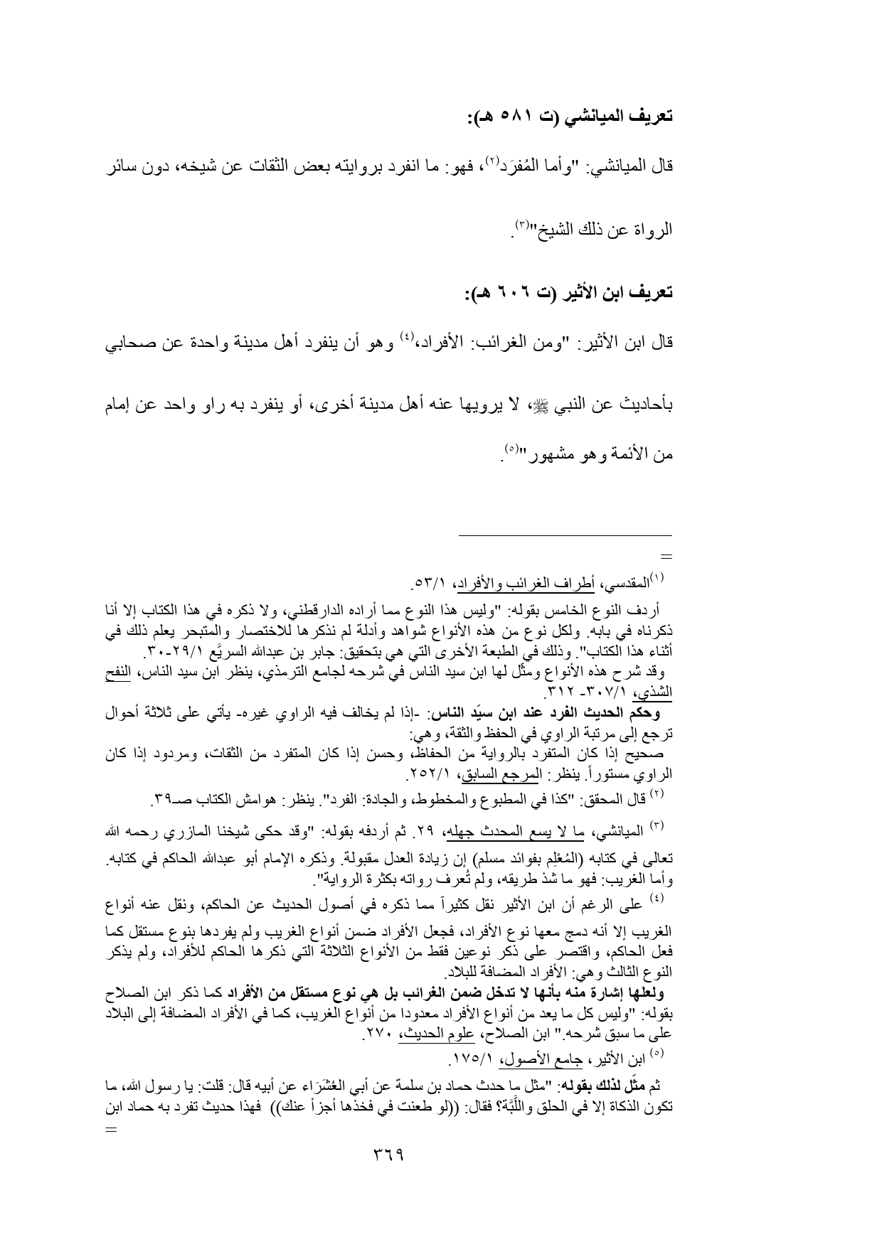 (¬3) على الرغم أن ابن الأثير نقل كثيراّ مما ذكره في أصول الحديث عن الحاكم، ونقل عنه أنواع الغريب إلا أنه دمج معها نوع الأفراد، فجعل الأفراد ضمن أنواع الغريب ولم يفردها بنوع مستقل كما فعل الحاكم، واقتصر على ذكر نوعين فقط من الأنواع الثلاثة التي ذكرها الحاكم للأفراد، ولم يذكر النوع الثالث وهي: الأفراد المضافة للبلاد.