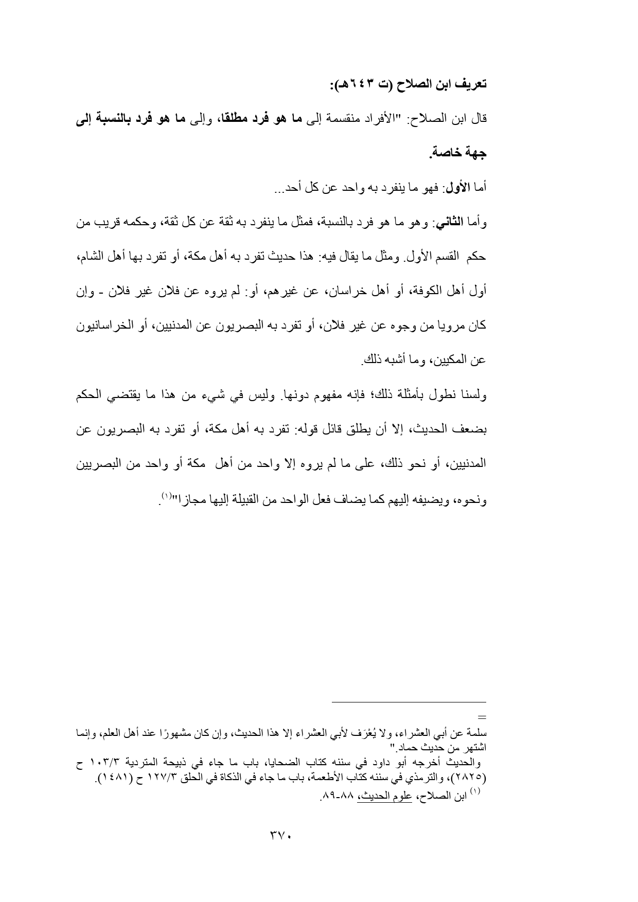 قال ابن الصلاح: "الأفراد منقسمة إلى ما هو فرد مطلقا، وإلى ما هو فرد بالنسبة إلى جهة خاصة.