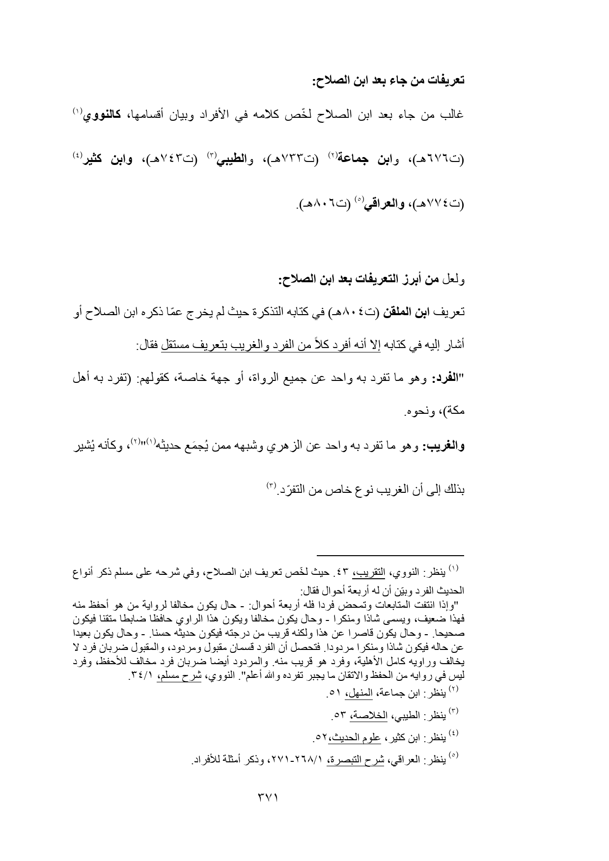 (¬1) ينظر: النووي، التقريب، 43. حيث لخّص تعريف ابن الصلاح، وفي شرحه على مسلم ذكر أنواع الحديث الفرد وبيّن أن له أربعة أحوال فقال: