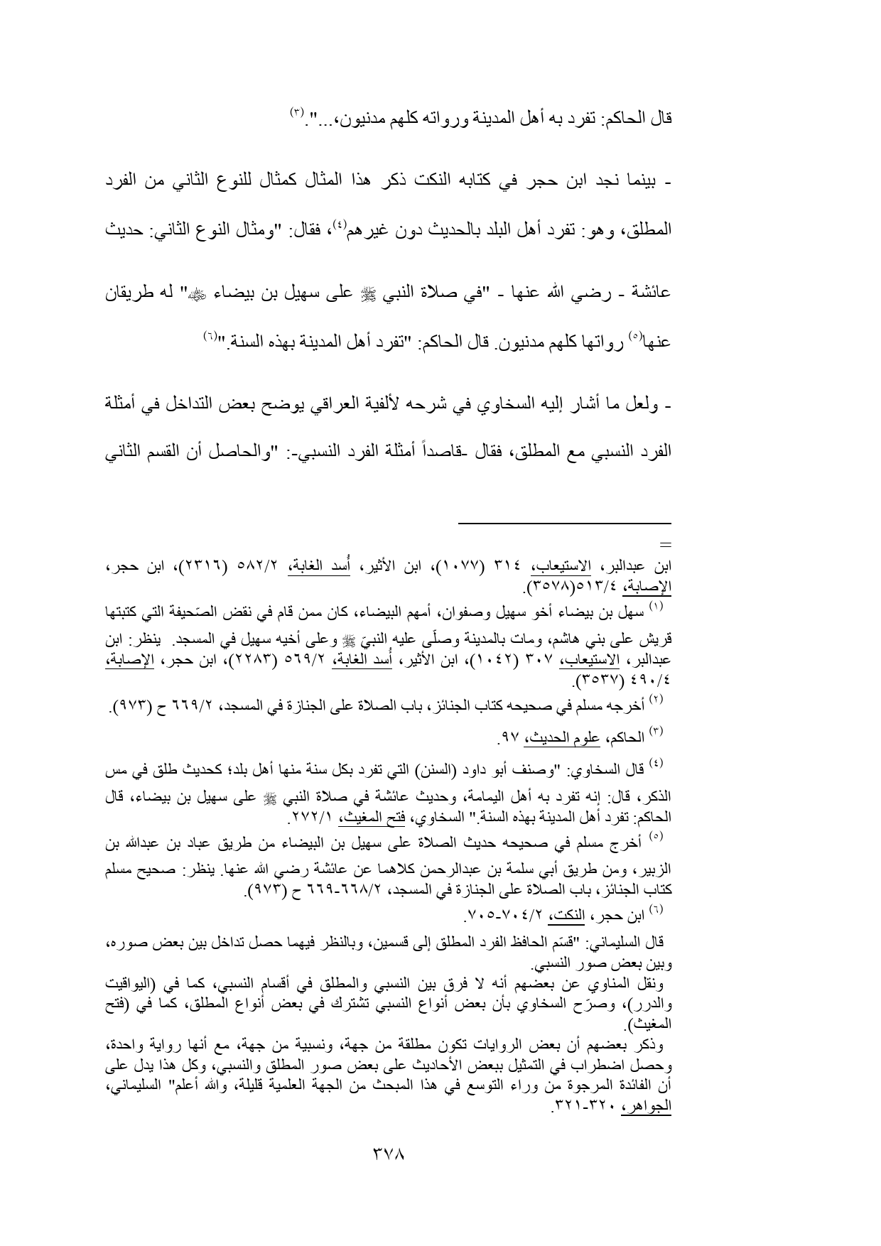 - بينما نجد ابن حجر في كتابه النكت ذكر هذا المثال كمثال للنوع الثاني من الفرد المطلق، وهو: تفرد أهل البلد بالحديث دون غيرهم (¬2)، فقال: "ومثال النوع الثاني: حديث عائشة - رضي الله عنها - "في صلاة النبي - صلى الله عليه وسلم - على سهيل بن بيضاء - رضي الله عنه - " له طريقان عنها (¬3) رواتها كلهم مدنيون. قال الحاكم: "تفرد أهل المدينة بهذه السنة." (¬4)