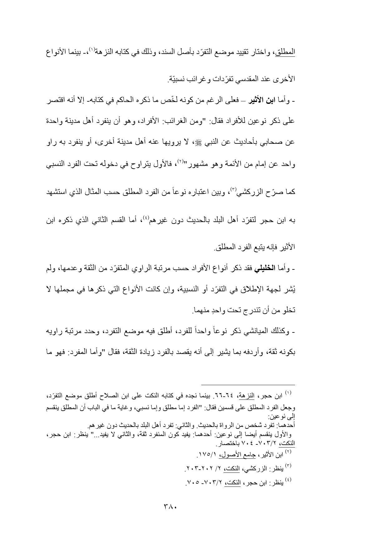 (¬1) ابن حجر، النزهة، 64 - 66. بينما نجده في كتابه النكت على ابن الصلاح أطلق موضع التفرّد، وجعل الفرد المطلق على قسمين فقال: "الفرد إما مطلق وإما نسبي، وغاية ما في الباب أن المطلق ينقسم إلى نوعين: