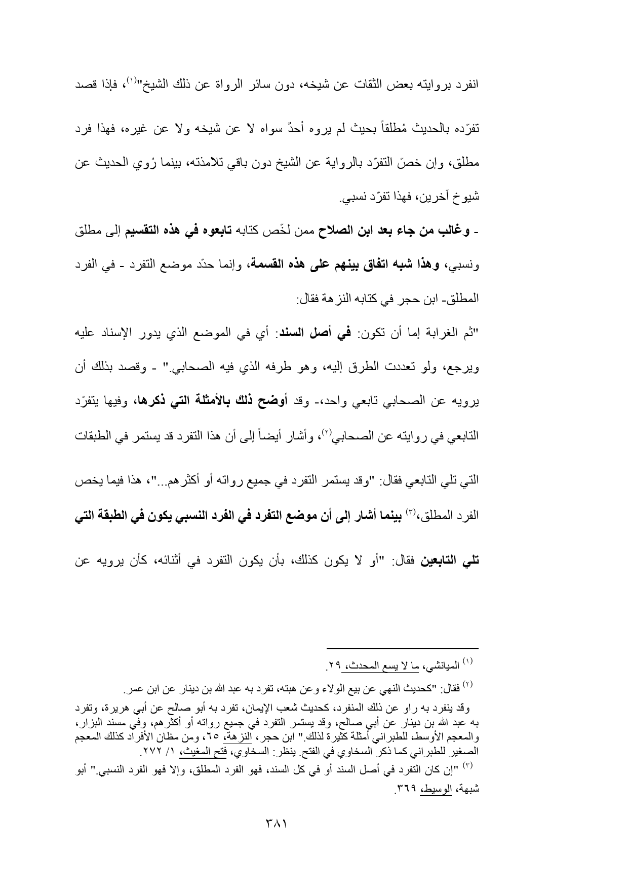 (¬3) "إن كان التفرد في أصل السند أو في كل السند, فهو الفرد المطلق, وإلا فهو الفرد النسبي." أبو شبهة، الوسيط، 369.