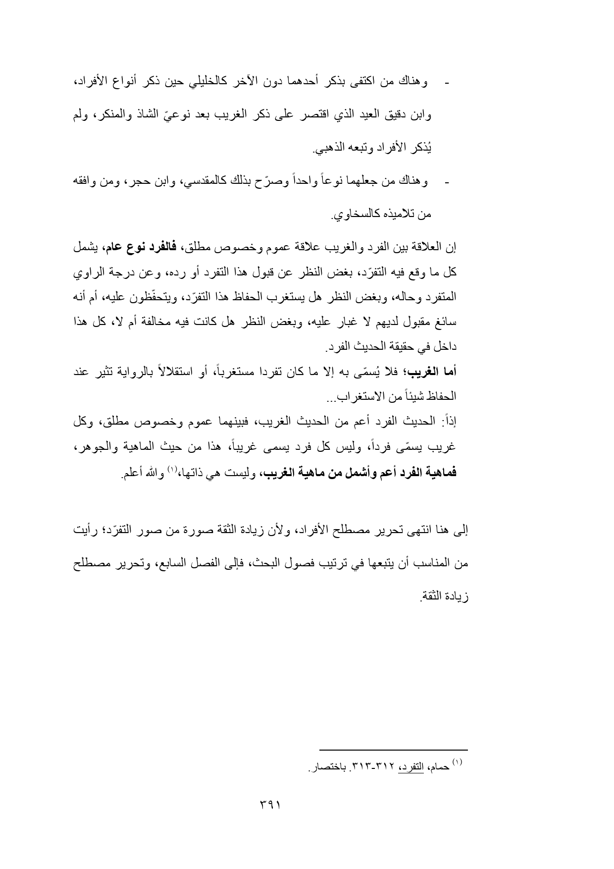 إلى هنا انتهى تحرير مصطلح الأفراد، ولأن زيادة الثقة صورة من صور التفرّد؛ رأيت من المناسب أن يتبعها في ترتيب فصول البحث، فإلى الفصل السابع، وتحرير مصطلح زيادة الثقة.