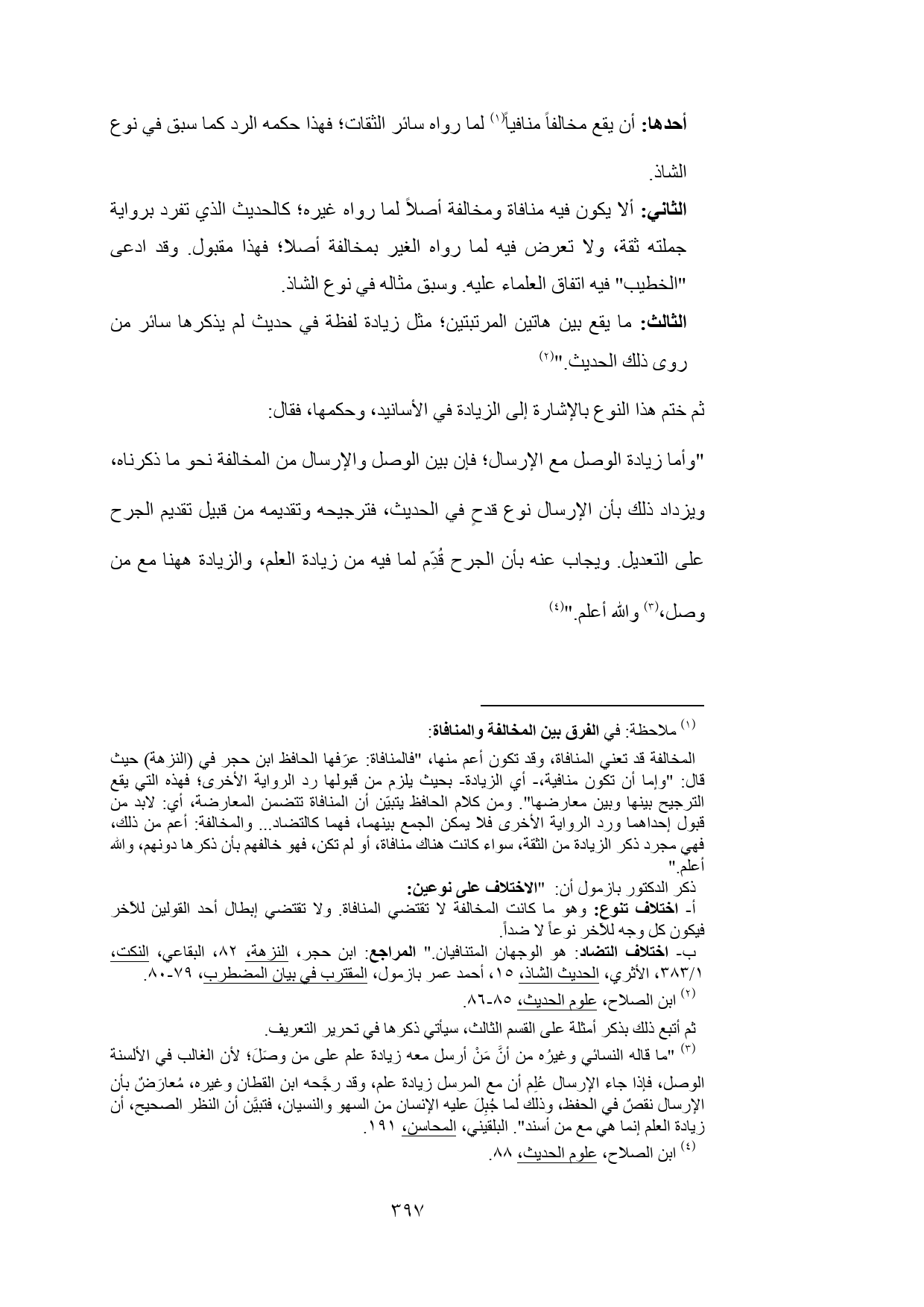 (¬1) ملاحظة: في الفرق بين المخالفة والمنافاة المراجع: ابن حجر، النزهة، 82، البقاعي، النكت، 1/ 383، الأثري، الحديث الشاذ، 15، أحمد عمر بازمول، المقترب في بيان المضطرب، 79 - 80.