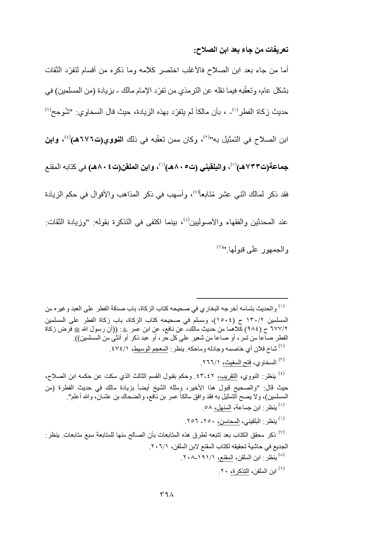 أما من جاء بعد ابن الصلاح فالأغلب اختصر كلامه وما ذكره من أقسام لتفرّد الثقات بشكل عام، وتعقّبه فيما نقله عن الترمذي من تفرّد الإمام مالك - بزيادة (من المسلمين) في حديث زكاة الفطر (¬1) -، بأن مالكاً لم يتفرّد بهذه الزيادة، حيث قال السخاوي: "شُوحِح (¬2) ابن الصلاح في التمثيل به" (¬3)، وكان ممن تعقّبه في ذلك النووي (ت 676 هـ) (¬4)، وابن جماعة (ت 733 هـ) (¬5)، والبلقيني (ت 805 هـ) (¬6)، وابن الملقن (ت 804 هـ) في كتابه المقنع فقد ذكر لمالك اثني عشر مُتابِعاً (¬7)، وأسهب في ذكر المذاهب والأقوال في حكم الزيادة عند المحدثين والفقهاء والأصوليين (¬8)، بينما اكتفى في التذكرة بقوله: "وزيادة الثقات: والجمهور على قبولها." (¬9)