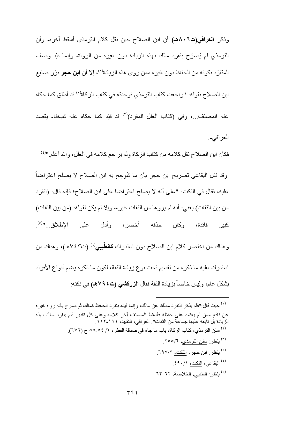 وذكر العراقي (ت 806 هـ) أن ابن الصلاح حين نقل كلام الترمذي أسقط آخره، وأن الترمذي لم يُصرّح بتفرد مالك بهذه الزيادة دون غيره من الرواة، وإنما قيّد وصف المتفرّد بكونه من الحفاظ دون غيره ممن روى هذه الزيادة (¬1)، إلا أن ابن حجر برّر صنيع ابن الصلاح بقوله: "راجعت كتاب الترمذي فوجدته في كتاب الزكاة (¬2) قد أطلق كما حكاه عنه المصنف ... ، وفي (كتاب العلل المفرد) (¬3) قد قيّد كما حكاه عنه شيخنا- يقصد العراقي-.