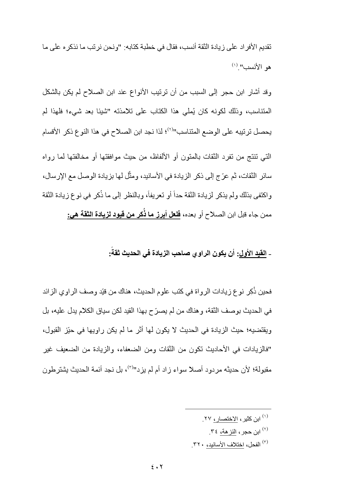 وقد أشار ابن حجر إلى السبب من أن ترتيب الأنواع عند ابن الصلاح لم يكن بالشكل المتناسب، وذلك لكونه كان يُملي هذا الكتاب على تلامذته "شيئا بعد شيء؛ فلهذا لم يحصل ترتيبه على الوضع المتناسب" (¬2)؛ لذا نجد ابن الصلاح في هذا النوع ذكر الأقسام التي تنتج من تفرد الثقات بالمتون أو الألفاظ، من حيث موافقتها أو مخالفتها لما رواه سائر الثقات، ثم عرّج إلى ذكر الزيادة في الأسانيد، ومثّل لها بزيادة الوصل مع الإرسال، واكتفى بذلك ولم يذكر لزيادة الثقة حداً أو تعريفاً، وبالنظر إلى ما ذُكر في نوع زيادة الثقة ممن جاء قبل ابن الصلاح أو بعده، فلعل أبرز ما ذُكر من قيود لزيادة الثقة هي: