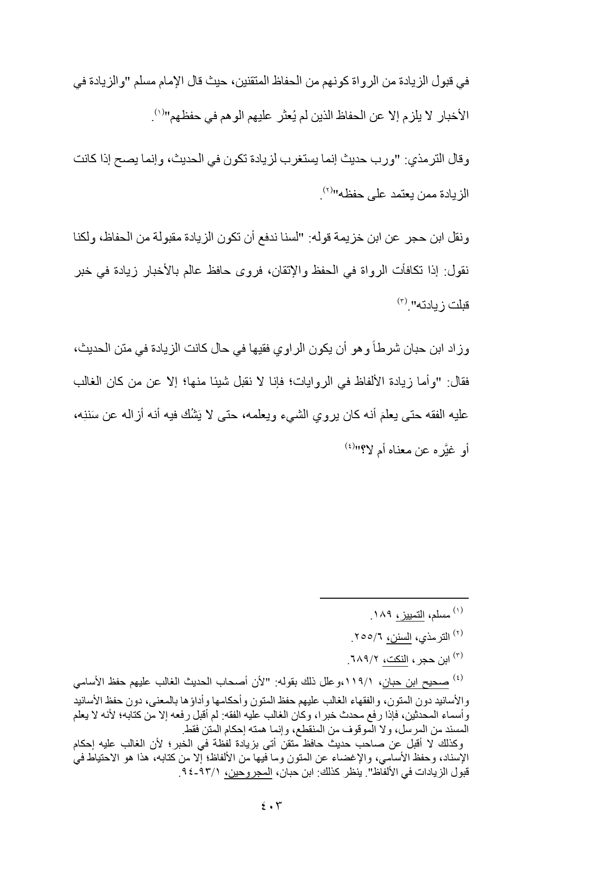 وكذلك لا أقبل عن صاحب حديث حافظ متقن أتى بزيادة لفظة في الخبر؛ لأن الغالب عليه إحكام الإسناد، وحفظ الأسامي، والإغضاء عن المتون وما فيها من الألفاظ؛ إلا من كتابه، هذا هو الاحتياط في قبول الزيادات في الألفاظ". ينظر كذلك: ابن حبان، المجروحين، 1/ 93 - 94.