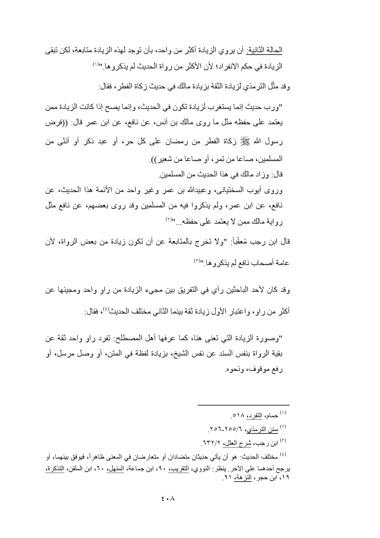 "وصورة الزيادة التي تعنى هنا، كما عرفها أهل المصطلح: تفرد راو واحد ثقة عن بقية الرواة بنفس السند عن نفس الشيخ، بزيادة لفظة في المتن، أو وصل مرسل، أو رفع موقوف، ونحوه.
