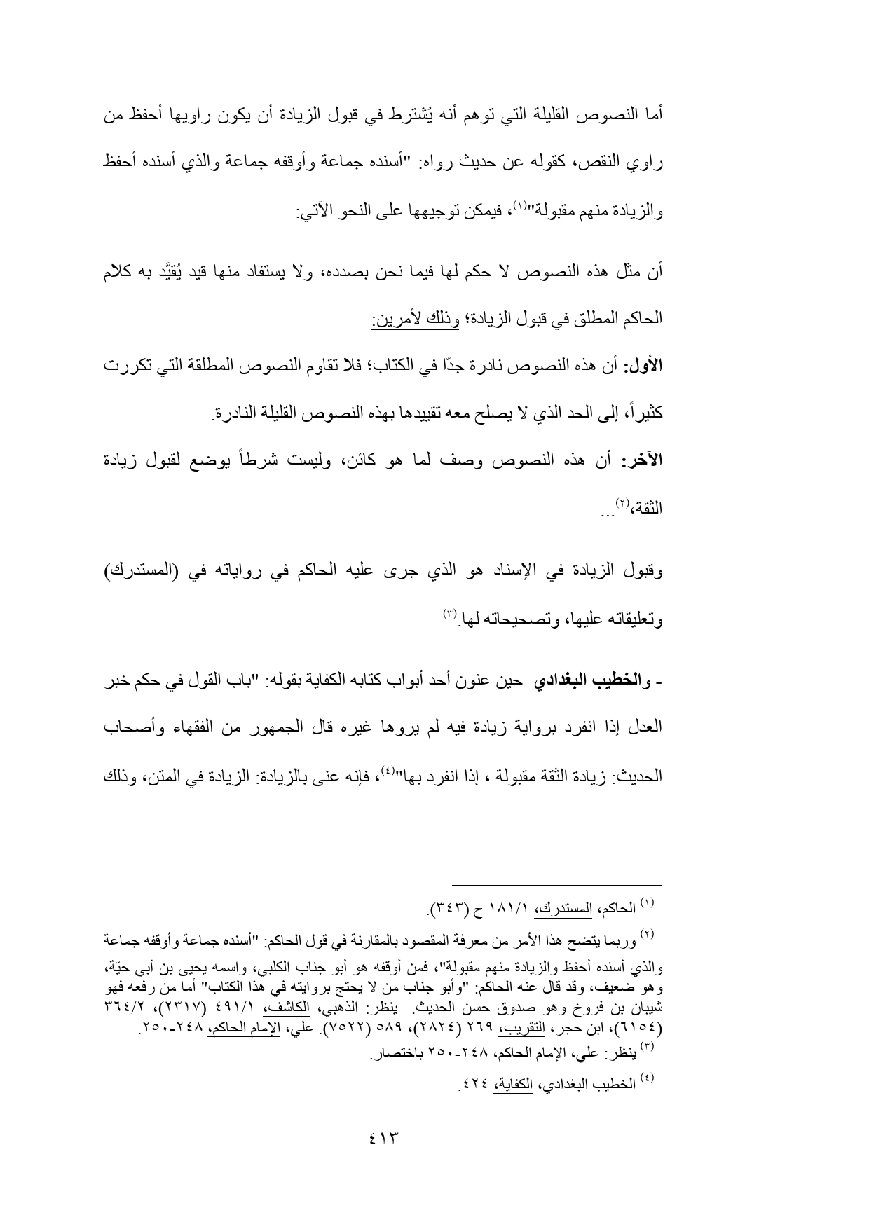 - والخطيب البغدادي حين عنون أحد أبواب كتابه الكفاية بقوله: "باب القول في حكم خبر العدل إذا انفرد برواية زيادة فيه لم يروها غيره قال الجمهور من الفقهاء وأصحاب الحديث: زيادة الثقة مقبولة , إذا انفرد بها" (¬4)، فإنه عنى بالزيادة: الزيادة في المتن، وذلك