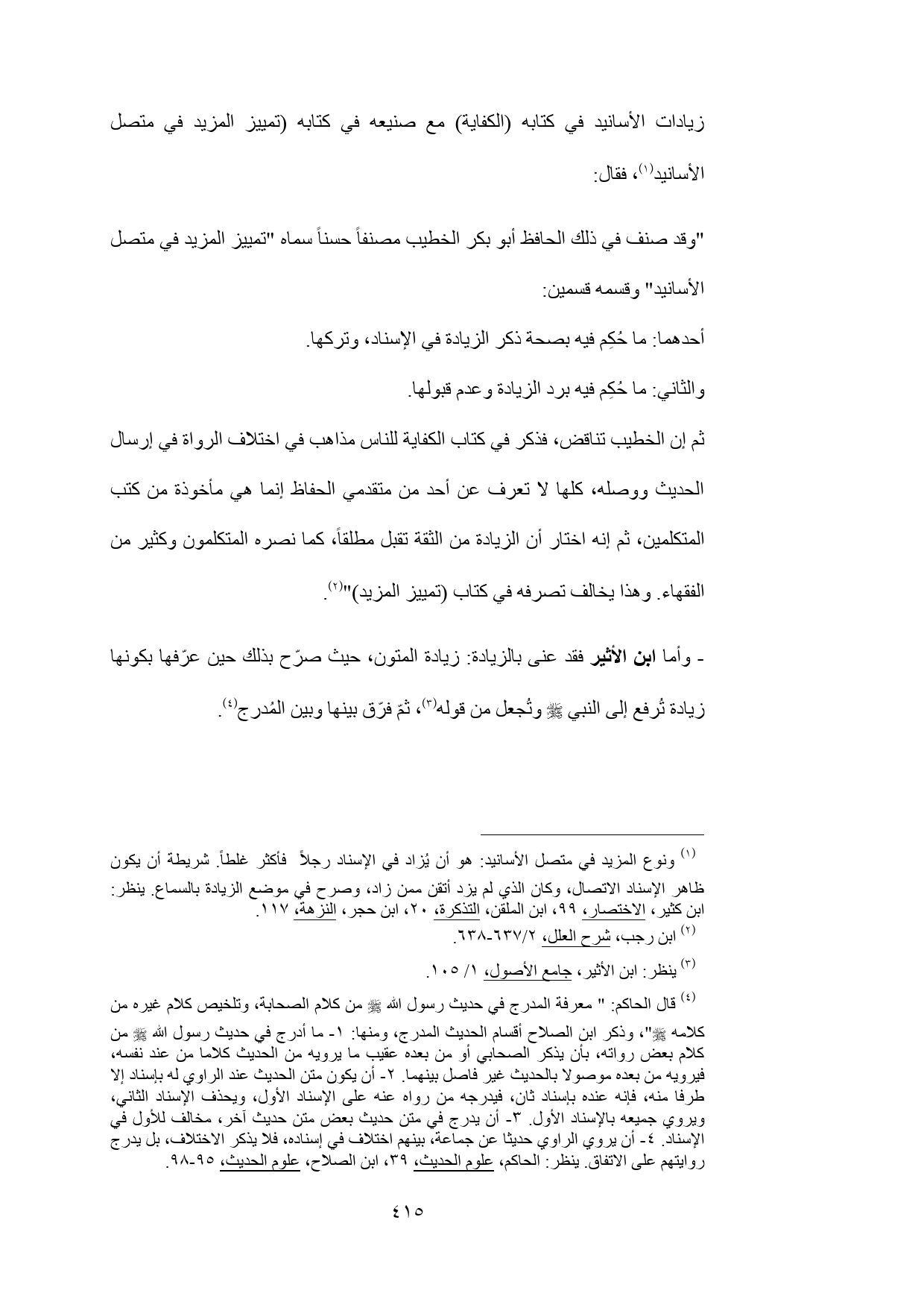 "وقد صنف في ذلك الحافظ أبو بكر الخطيب مصنفاً حسناً سماه "تمييز المزيد في متصل الأسانيد" وقسمه قسمين: