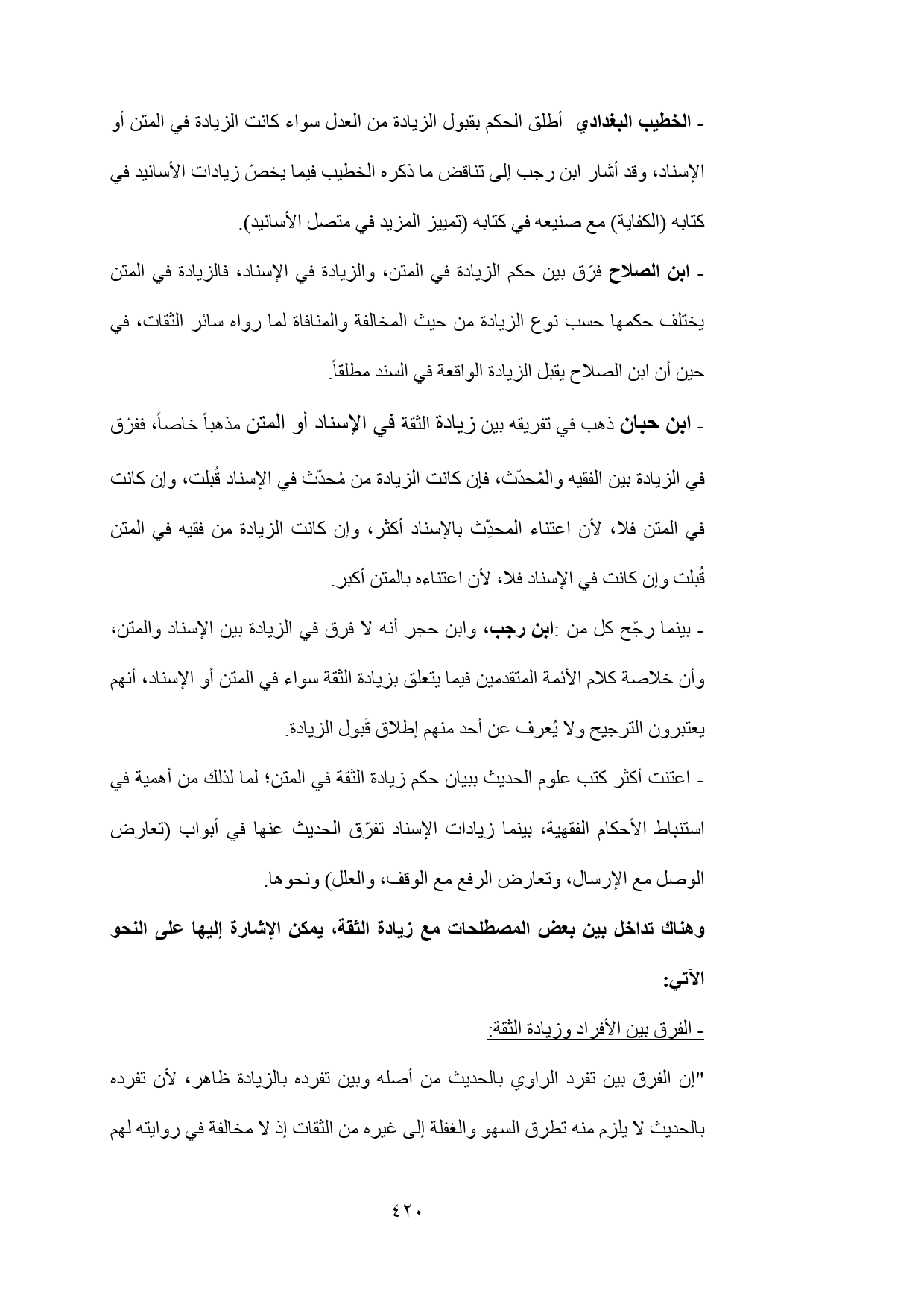 - بينما رجّح كل من: ابن رجب، وابن حجر أنه لا فرق في الزيادة بين الإسناد والمتن، وأن خلاصة كلام الأئمة المتقدمين فيما يتعلق بزيادة الثقة سواء في المتن أو الإسناد، أنهم يعتبرون الترجيح ولا يُعرف عن أحد منهم إطلاق قَبول الزيادة.
