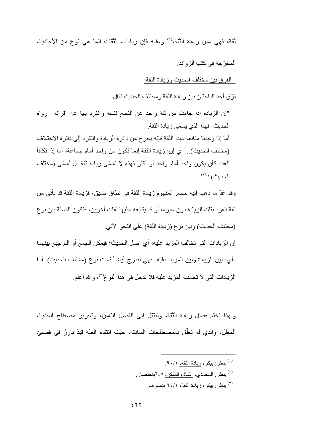 وبهذا نختم فصل زيادة الثقة، وننتقل إلى الفصل الثامن، وتحرير مصطلح الحديث المعلل، والذي له تعلّق بالمصطلحات السابقة، حيث انتفاء العلة قيدٌ بارزٌ في فصليّ