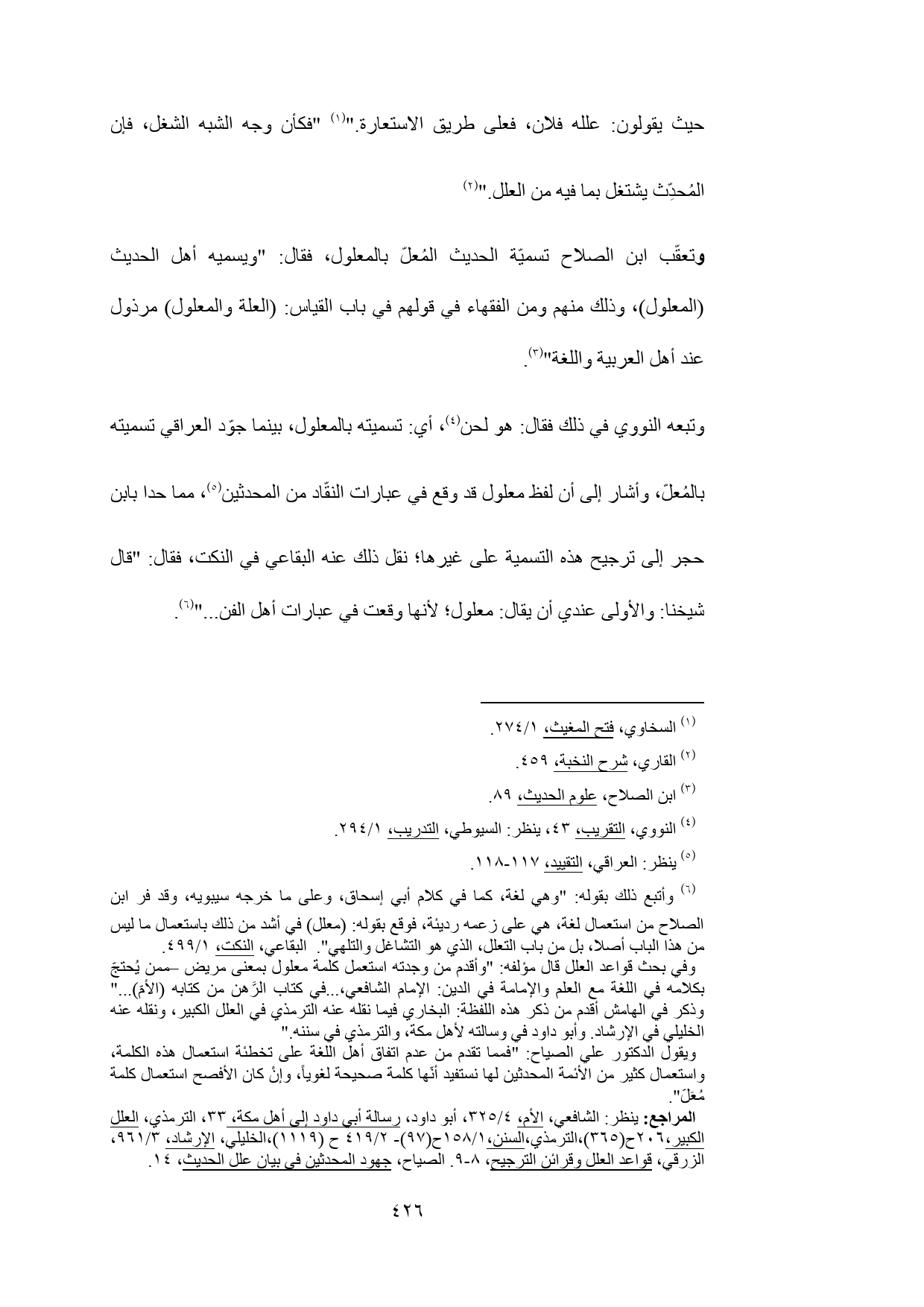 (¬6) وأتبع ذلك بقوله: "وهي لغة، كما في كلام أبي إسحاق، وعلى ما خرجه سيبويه، وقد فر ابن الصلاح من استعمال لغة، هي على زعمه رديئة، فوقع بقوله: (معلل) في أشد من ذلك باستعمال ما ليس من هذا الباب أصلا، بل من باب التعلل، الذي هو التشاغل والتلهي". البقاعي، النكت، 1/ 499.
