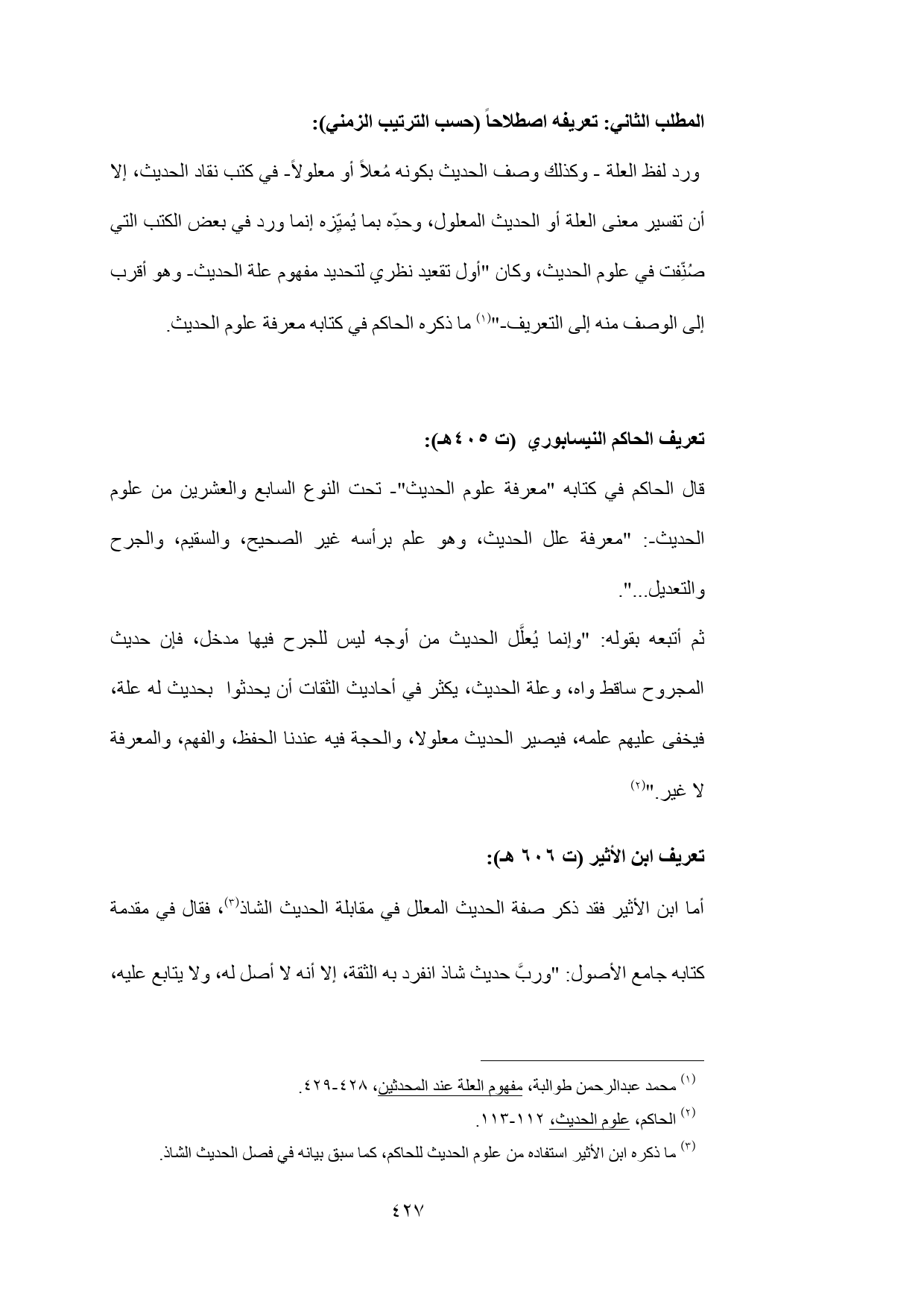 (¬1) محمد عبدالرحمن طوالبة، مفهوم العلة عند المحدثين، 428 - 429.