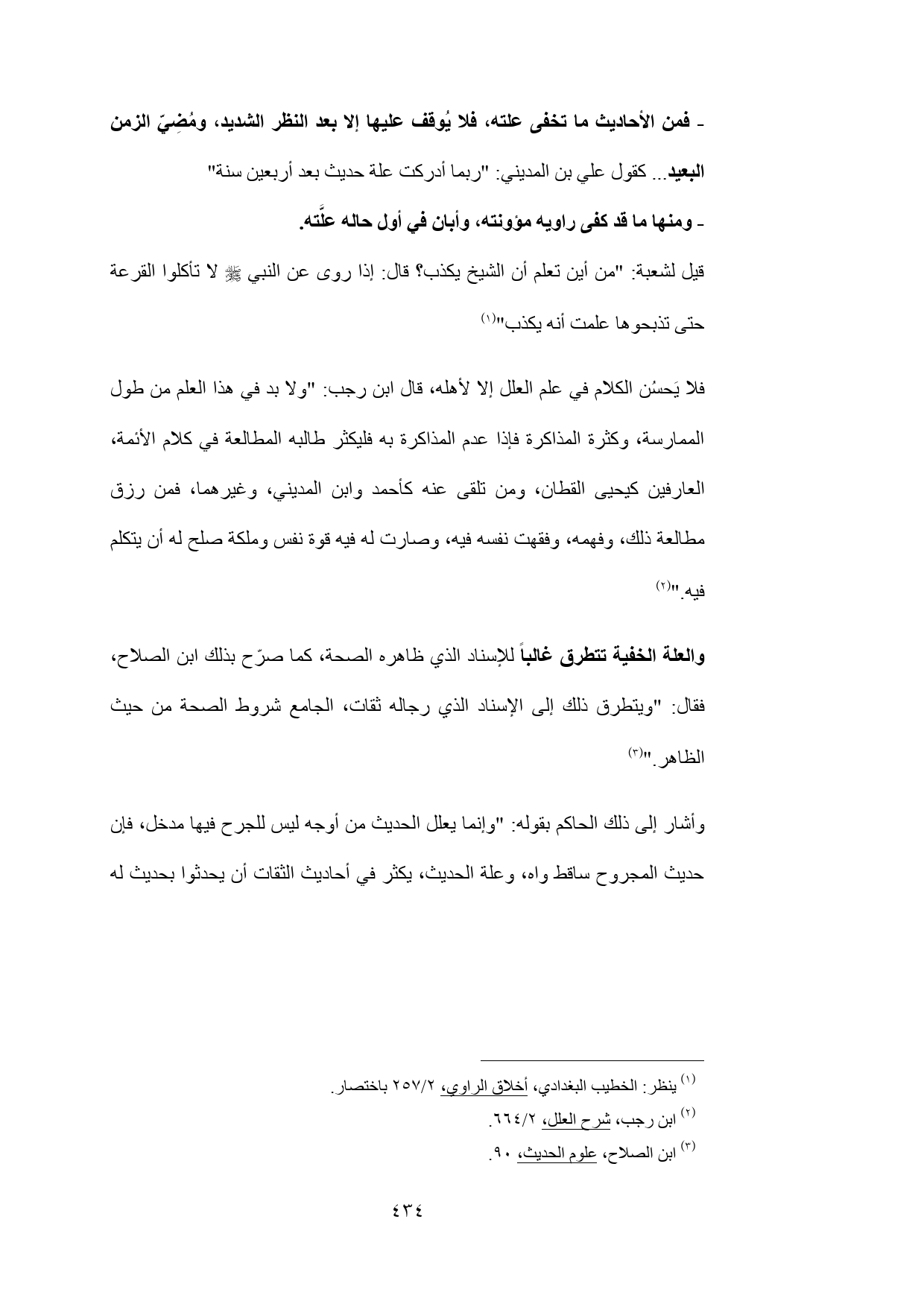 - فمن الأحاديث ما تخفى علته، فلا يُوقف عليها إلا بعد النظر الشديد، ومُضِيّ الزمن البعيد ... كقول علي بن المديني: "ربما أدركت علة حديث بعد أربعين سنة"