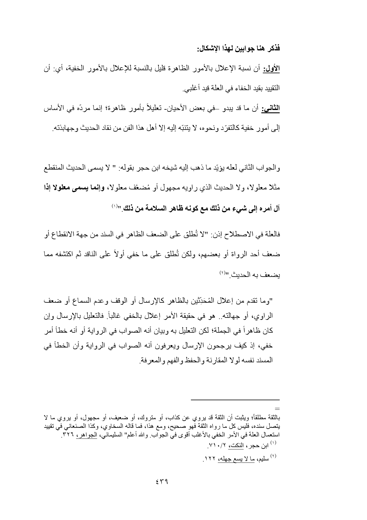 "وما تقدم من إعلال المُحَدِّثين بالظاهر كالإرسال أو الوقف وعدم السماع أو ضعف الراوي، أو جهالته .. هو في حقيقة الأمر إعلال بالخفي غالباً. فالتعليل بالإرسال وإن كان ظاهراً في الجملة؛ لكن التعليل به وبيان أنه الصواب في الرواية أو أنه خطأ أمر خفي، إذ كيف يرجحون الإرسال ويعرفون أنه الصواب في الرواية وأن الخطأ في المسند نفسه لولا المقارنة والحفظ والفهم والمعرفة.