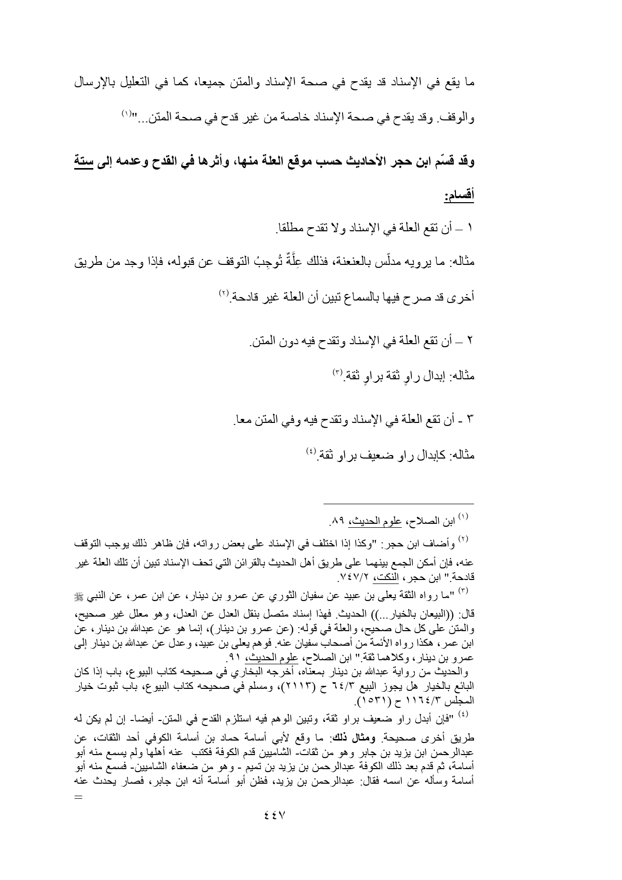 ما يقع في الإسناد قد يقدح في صحة الإسناد والمتن جميعا، كما في التعليل بالإرسال والوقف. وقد يقدح في صحة الإسناد خاصة من غير قدح في صحة المتن ... " (¬1)