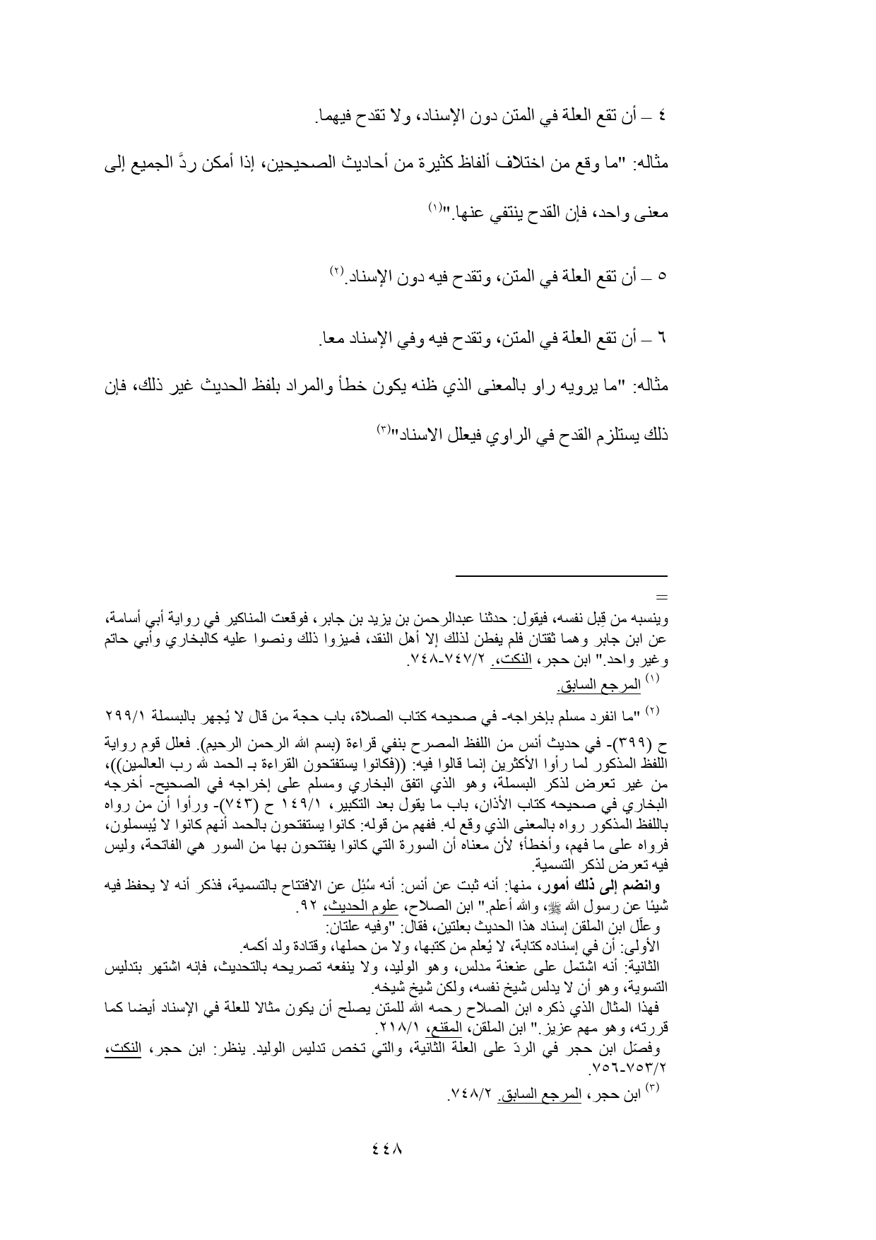 فهذا المثال الذي ذكره ابن الصلاح رحمه الله للمتن يصلح أن يكون مثالا للعلة في الإسناد أيضا كما قررته، وهو مهم عزيز." ابن الملقن، المقنع، 1/ 218.