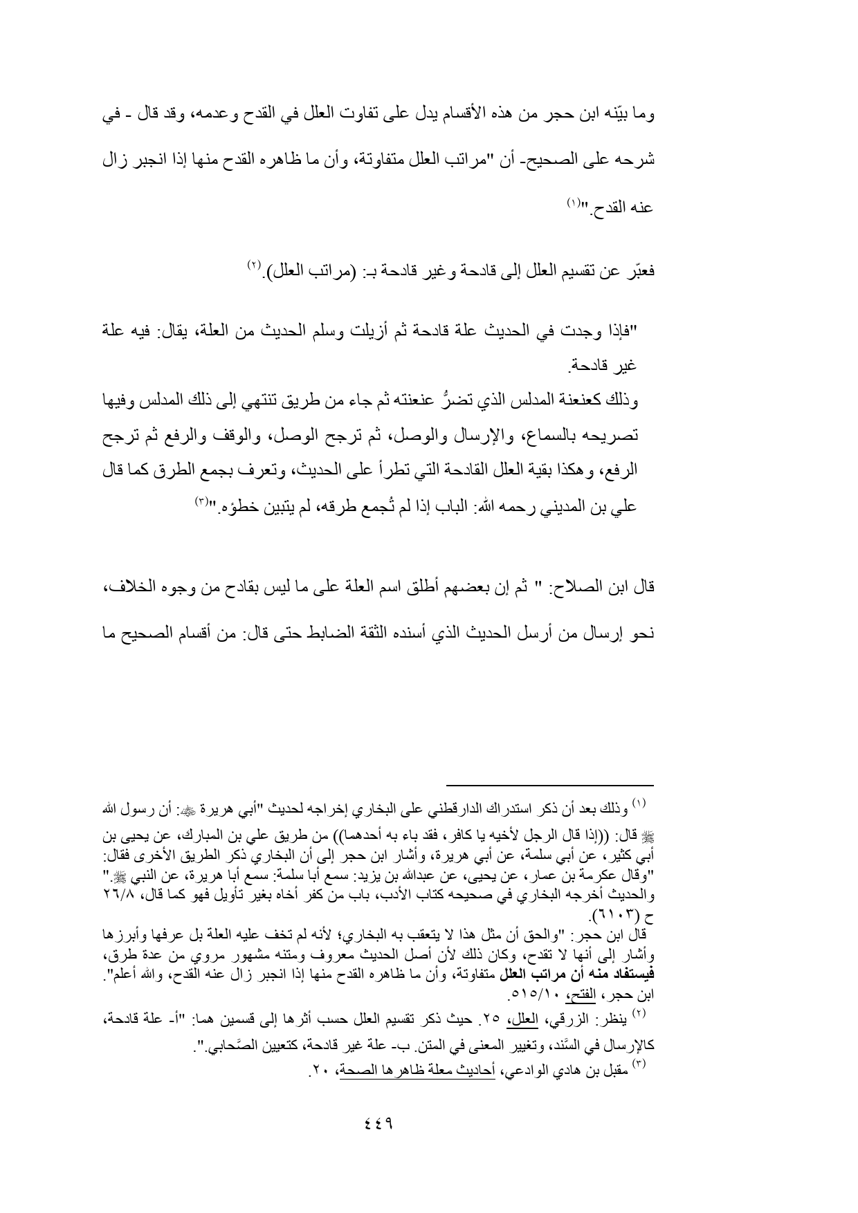 (¬2) ينظر: الزرقي، العلل، 25. حيث ذكر تقسيم العلل حسب أثرها إلى قسمين هما: "أ- علة قادحة، كالإرسال في السَّند، وتغيير المعنى في المتن. ب- علة غير قادحة، كتعيين الصَّحابي.".