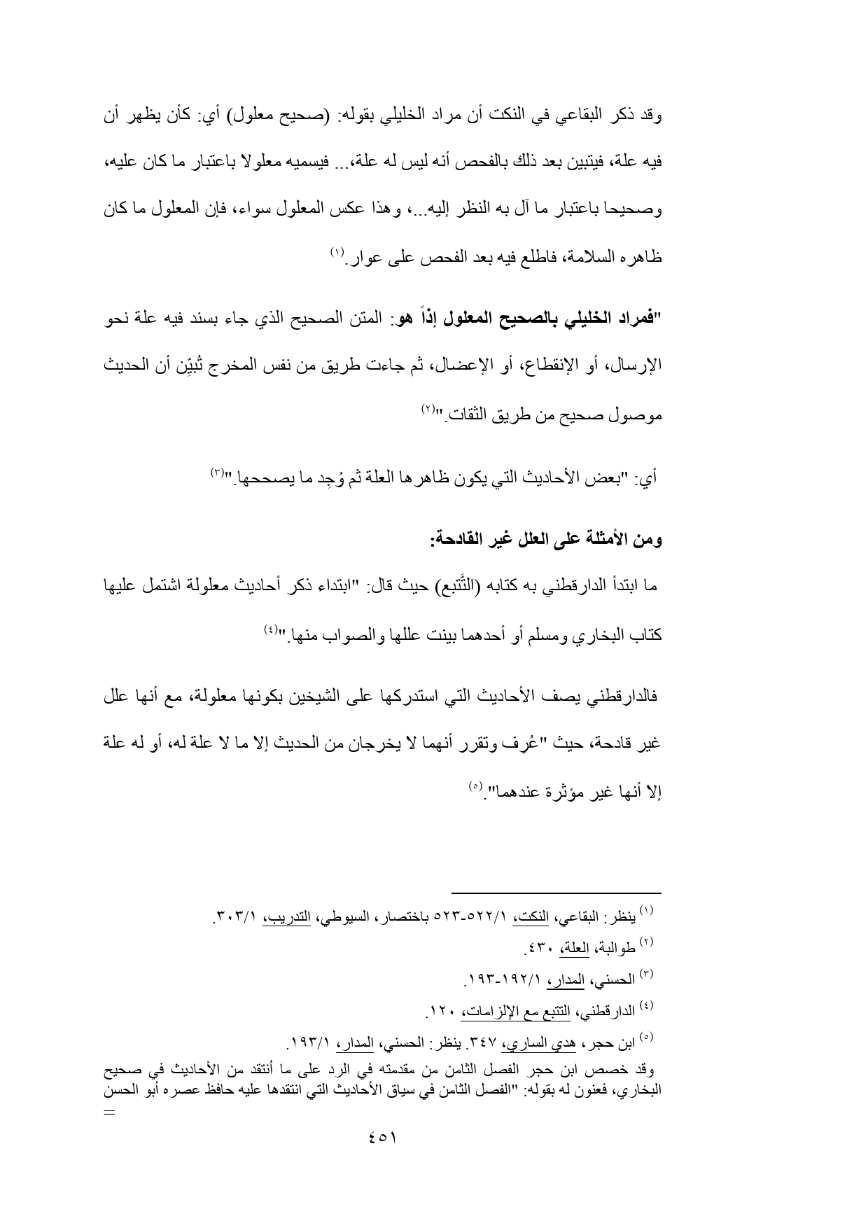 وقد ذكر البقاعي في النكت أن مراد الخليلي بقوله: (صحيح معلول) أي: كأن يظهر أن فيه علة، فيتبين بعد ذلك بالفحص أنه ليس له علة، ... فيسميه معلولا باعتبار ما كان عليه، وصحيحا باعتبار ما آل به النظر إليه ... ، وهذا عكس المعلول سواء، فإن المعلول ما كان ظاهره السلامة، فاطلع فيه بعد الفحص على عوار. (¬1)