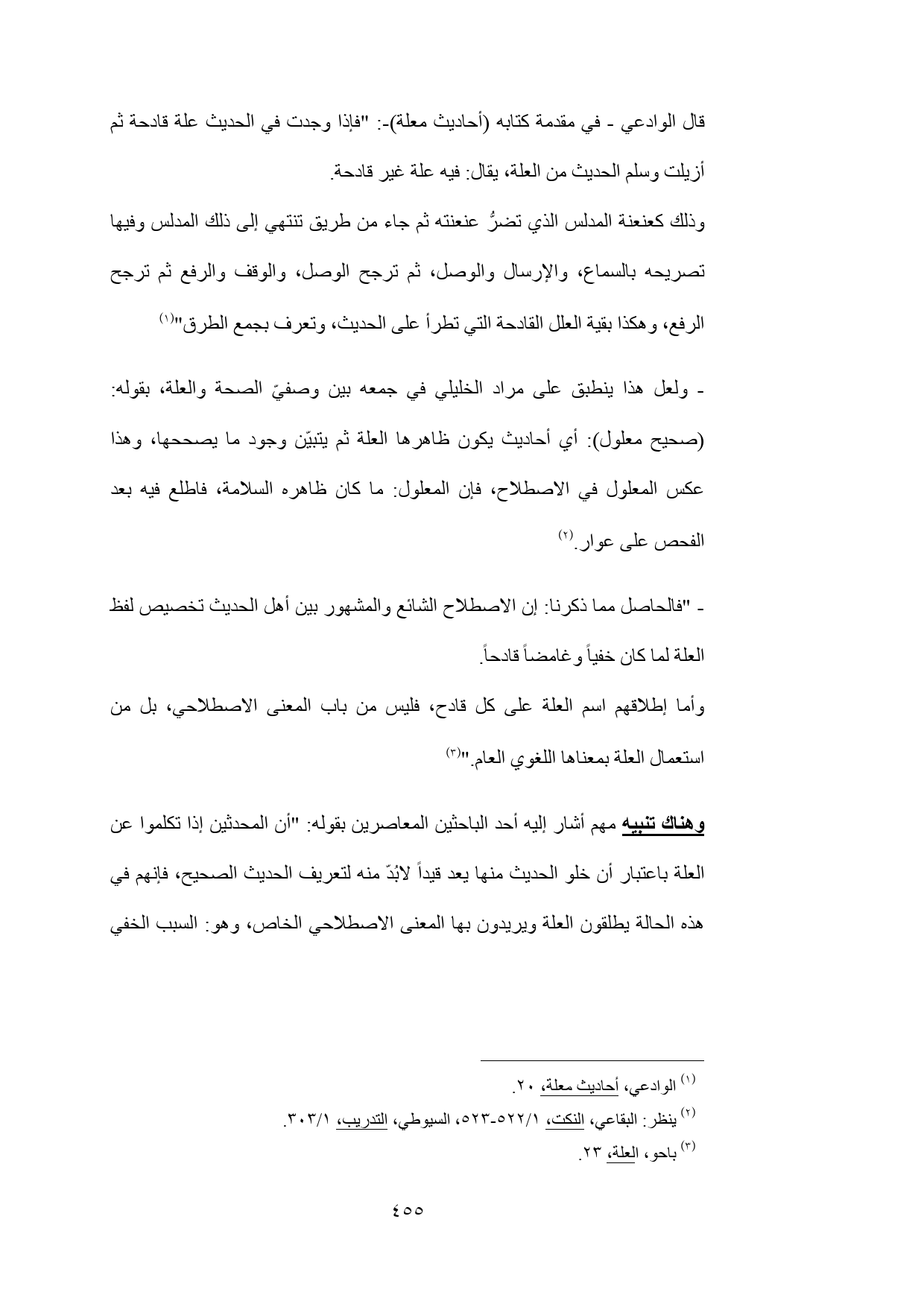 - "فالحاصل مما ذكرنا: إن الاصطلاح الشائع والمشهور بين أهل الحديث تخصيص لفظ العلة لما كان خفياً وغامضاً قادحاً.