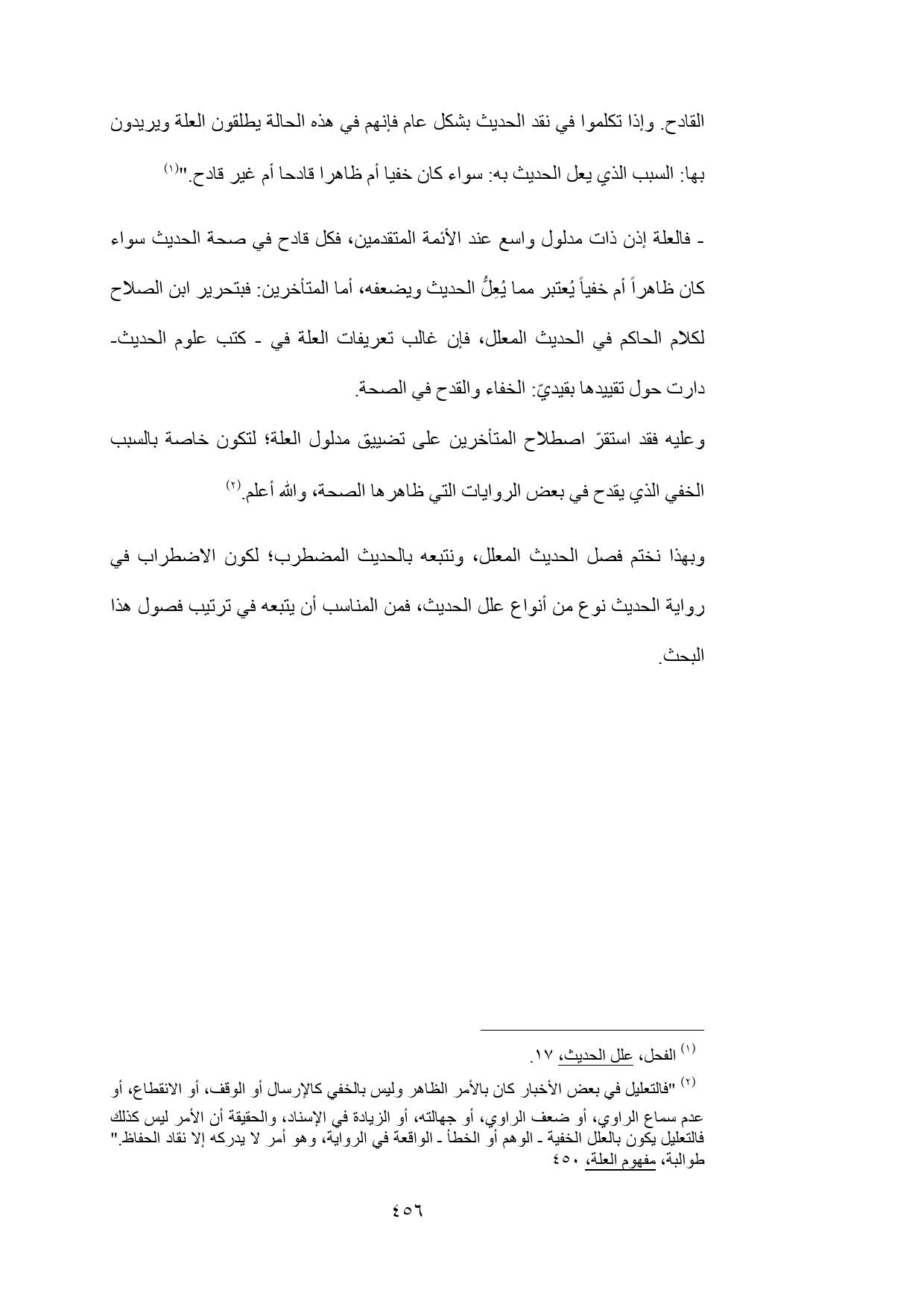 (¬2) "فالتعليل في بعض الأخبار كان بالأمر الظاهر وليس بالخفي كالإرسال أو الوقف، أو الانقطاع، أو عدم سماع الراوي، أو ضعف الراوي، أو جهالته، أو الزيادة في الإسناد، والحقيقة أن الأمر ليس كذلك فالتعليل يكون بالعلل الخفية ـ الوهم أو الخطأ ـ الواقعة في الرواية، وهو أمر لا يدركه إلا نقاد الحفاظ." طوالبة، مفهوم العلة، 450