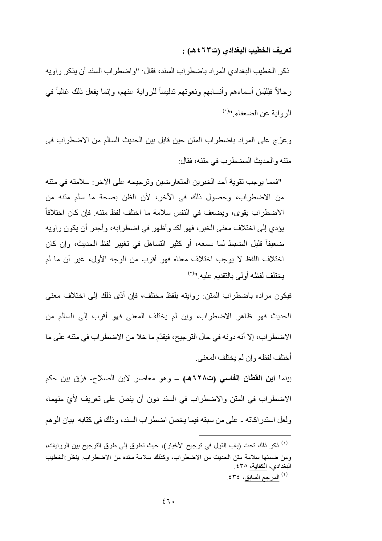 (¬1) ذكر ذلك تحت (باب القول في ترجيح الأخبار)، حيث تطرق إلى طرق الترجيح بين الروايات، ومن ضمنها سلامة متن الحديث من الاضطراب، وكذلك سلامة سنده من الاضطراب. ينظر: الخطيب البغدادي، الكفاية، 435.