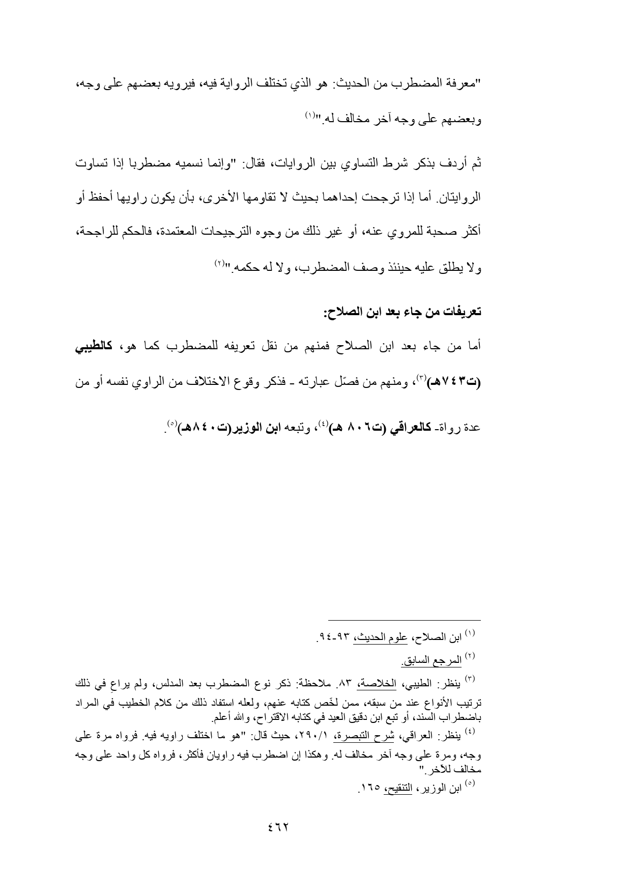 أما من جاء بعد ابن الصلاح فمنهم من نقل تعريفه للمضطرب كما هو، كالطيبي (ت 743 هـ) (¬3)، ومنهم من فصّل عبارته - فذكر وقوع الاختلاف من الراوي نفسه أو من عدة رواة- كالعراقي (ت 806 هـ) (¬4)، وتبعه ابن الوزير (ت 840 هـ) (¬5).