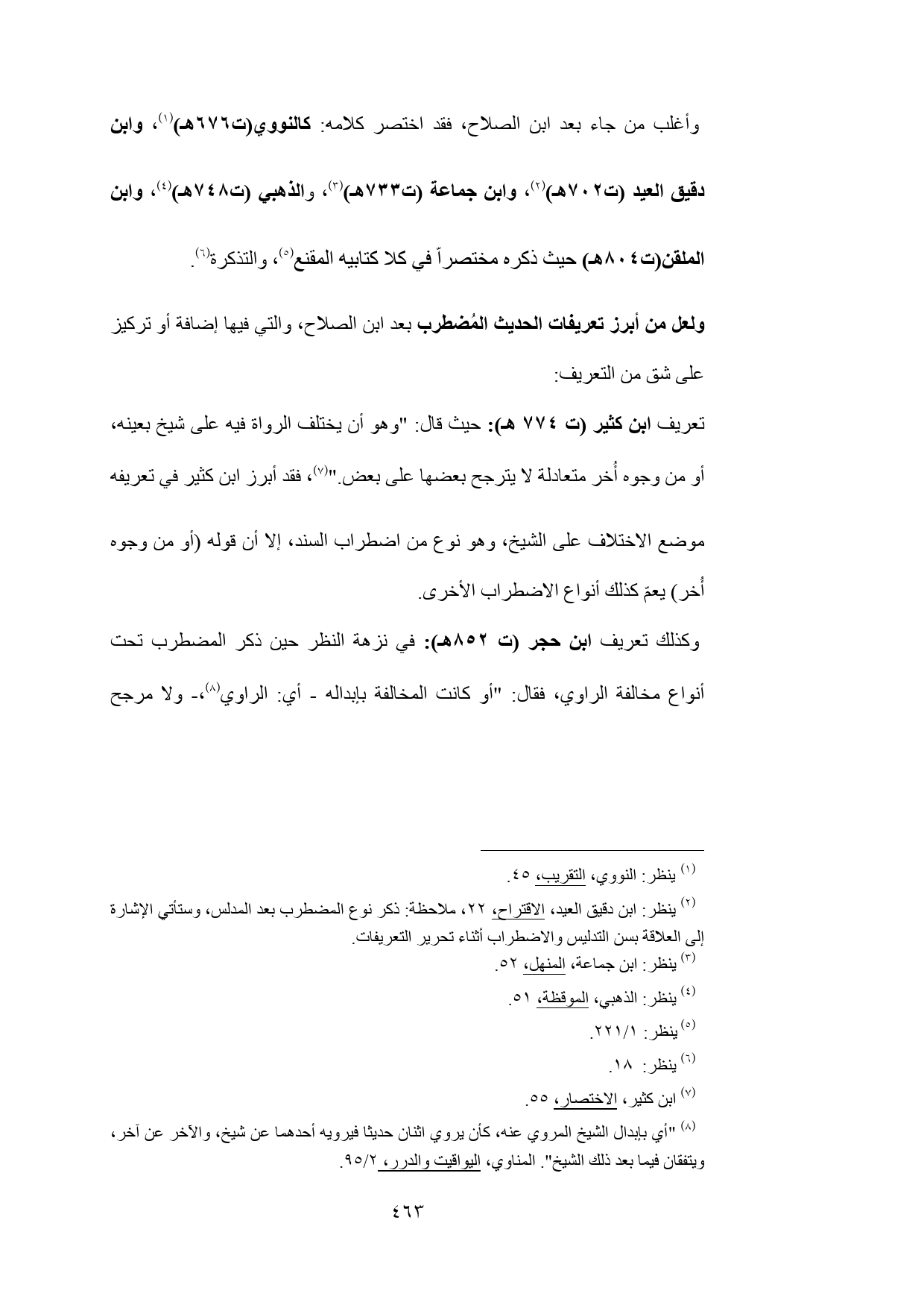 تعريف ابن كثير (ت 774 هـ): حيث قال: "وهو أن يختلف الرواة فيه على شيخ بعينه، أو من وجوه أُخر متعادلة لا يترجح بعضها على بعض." (¬7)، فقد أبرز ابن كثير في تعريفه موضع الاختلاف على الشيخ، وهو نوع من اضطراب السند، إلا أن قوله (أو من وجوه أُخر) يعمّ كذلك أنواع الاضطراب الأخرى.