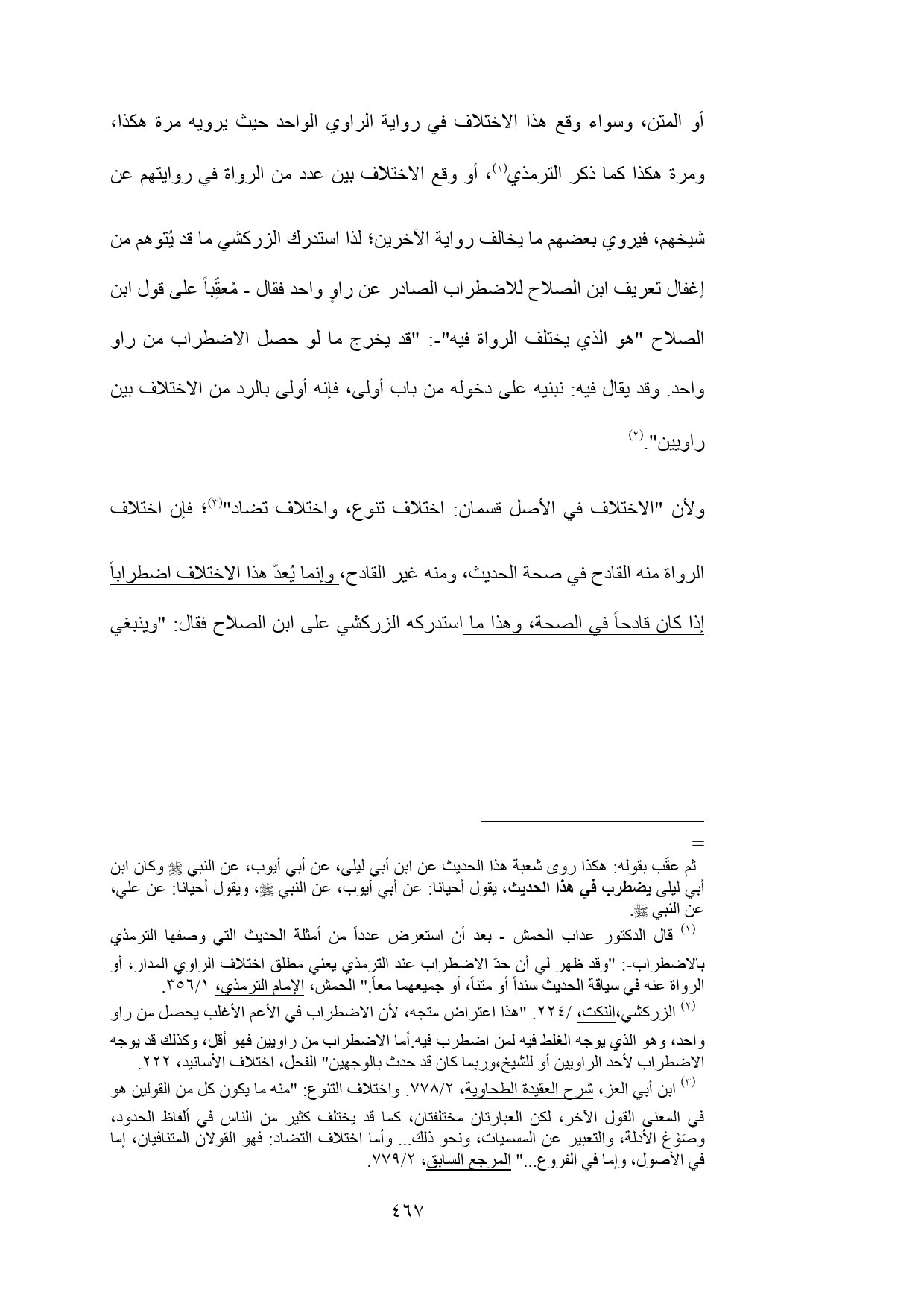 (¬2) الزركشي، النكت، /224. "هذا اعتراض متجه، لأن الاضطراب في الأعم الأغلب يحصل من راو واحد، وهو الذي يوجه الغلط فيه لمن اضطرب فيه. أما الاضطراب من راويين فهو أقل، وكذلك قد يوجه الاضطراب لأحد الراويين أو للشيخ، وربما كان قد حدث بالوجهين" الفحل، اختلاف الأسانيد، 222.