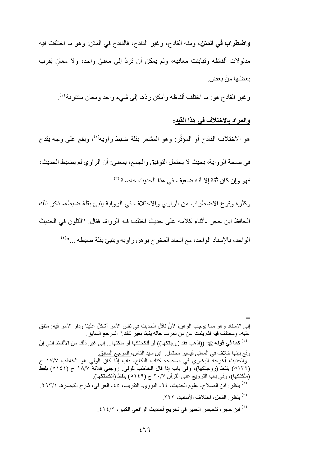 واضطراب في المتن، ومنه القادح، وغير القادح، فالقادح في المتن: وهو ما اختلفت فيه مدلولات ألفاظه وتباينت معانيه، ولم يمكن أن تردَّ إلى معنىَّ واحد، ولا معانٍ يَقرب بعضُها منْ بعض.