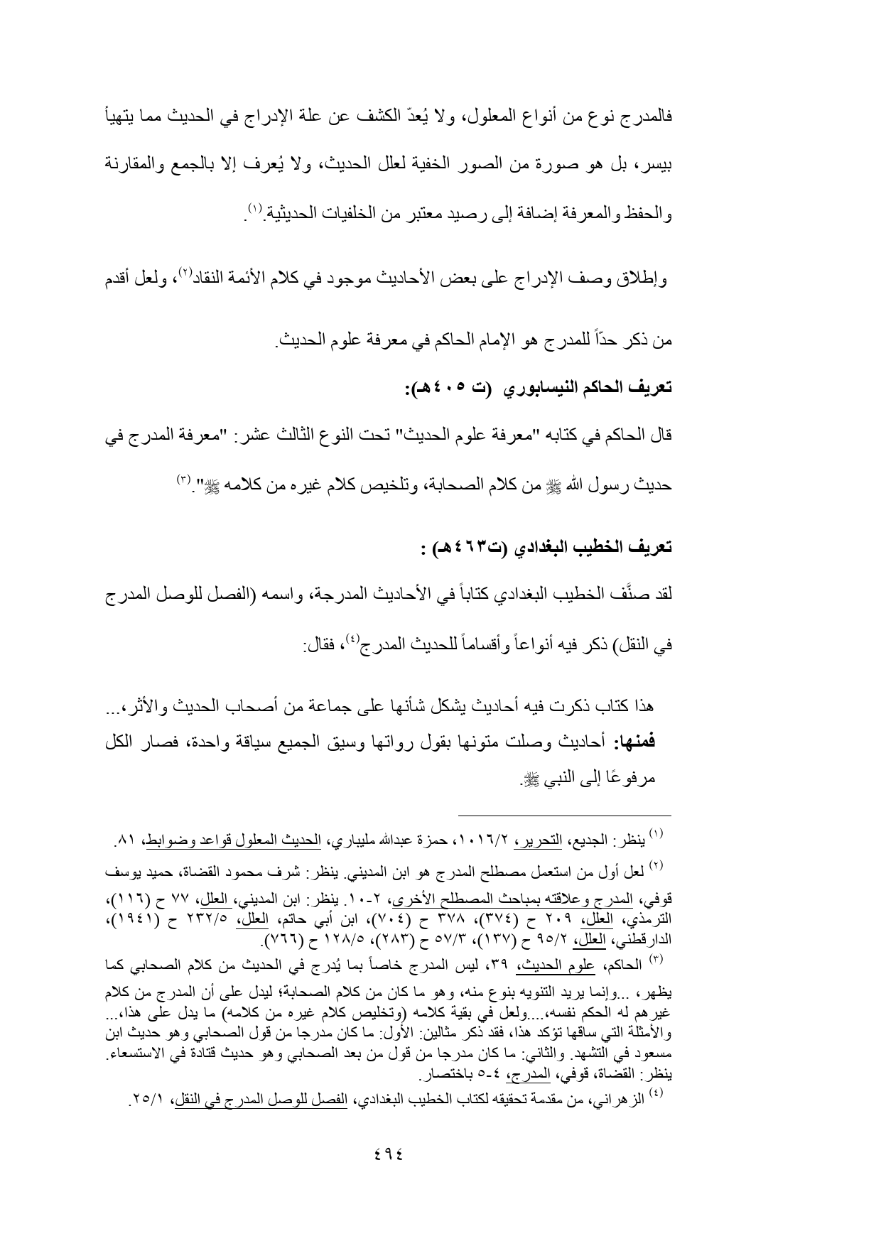(¬2) لعل أول من استعمل مصطلح المدرج هو ابن المديني. ينظر: شرف محمود القضاة، حميد يوسف قوفي، المدرج وعلاقته بمباحث المصطلح الأخرى، 2 - 10. ينظر: ابن المديني، العلل، 77 ح (116)، الترمذي، العلل، 209 ح (374)، 378 ح (704)، ابن أبي حاتم، العلل، 5/ 232 ح (1941)، الدارقطني، العلل، 2/ 95 ح (137)، 3/ 57 ح (283)، 5/ 128 ح (766).