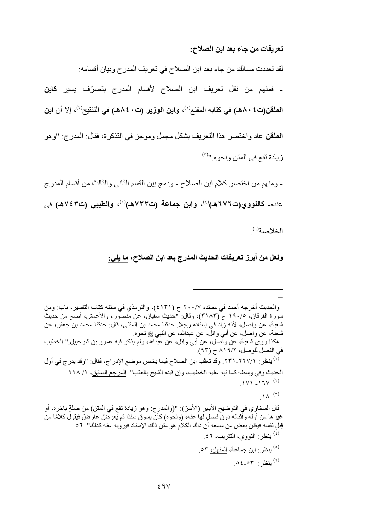 - فمنهم من نقل تعريف ابن الصلاح لأقسام المدرج بتصرّف يسير كابن الملقن (ت 804 هـ) في كتابه المقنع (¬1)، وابن الوزير (ت 840 هـ) في التنقيح (¬2)، إلا أن ابن الملقن عاد واختصر هذا التعريف بشكل مجمل وموجز في التذكرة، فقال: المدرج: "وهو زيادة تقع في المتن ونحوه." (¬3)