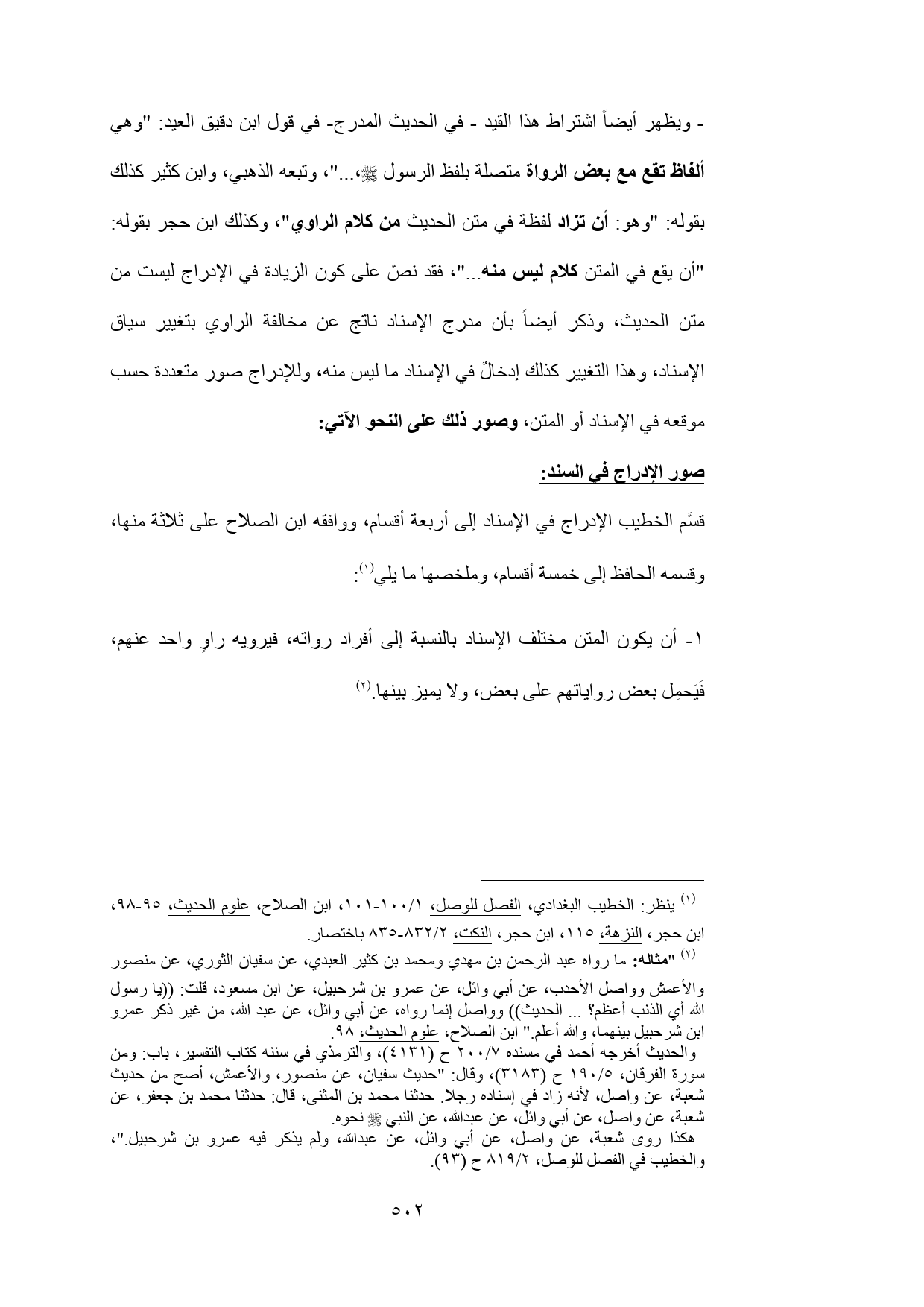 (¬1) ينظر: الخطيب البغدادي، الفصل للوصل، 1/ 100 - 101، ابن الصلاح، علوم الحديث، 95 - 98، ابن حجر، النزهة، 115، ابن حجر، النكت، 2/ 832 - 835 باختصار.