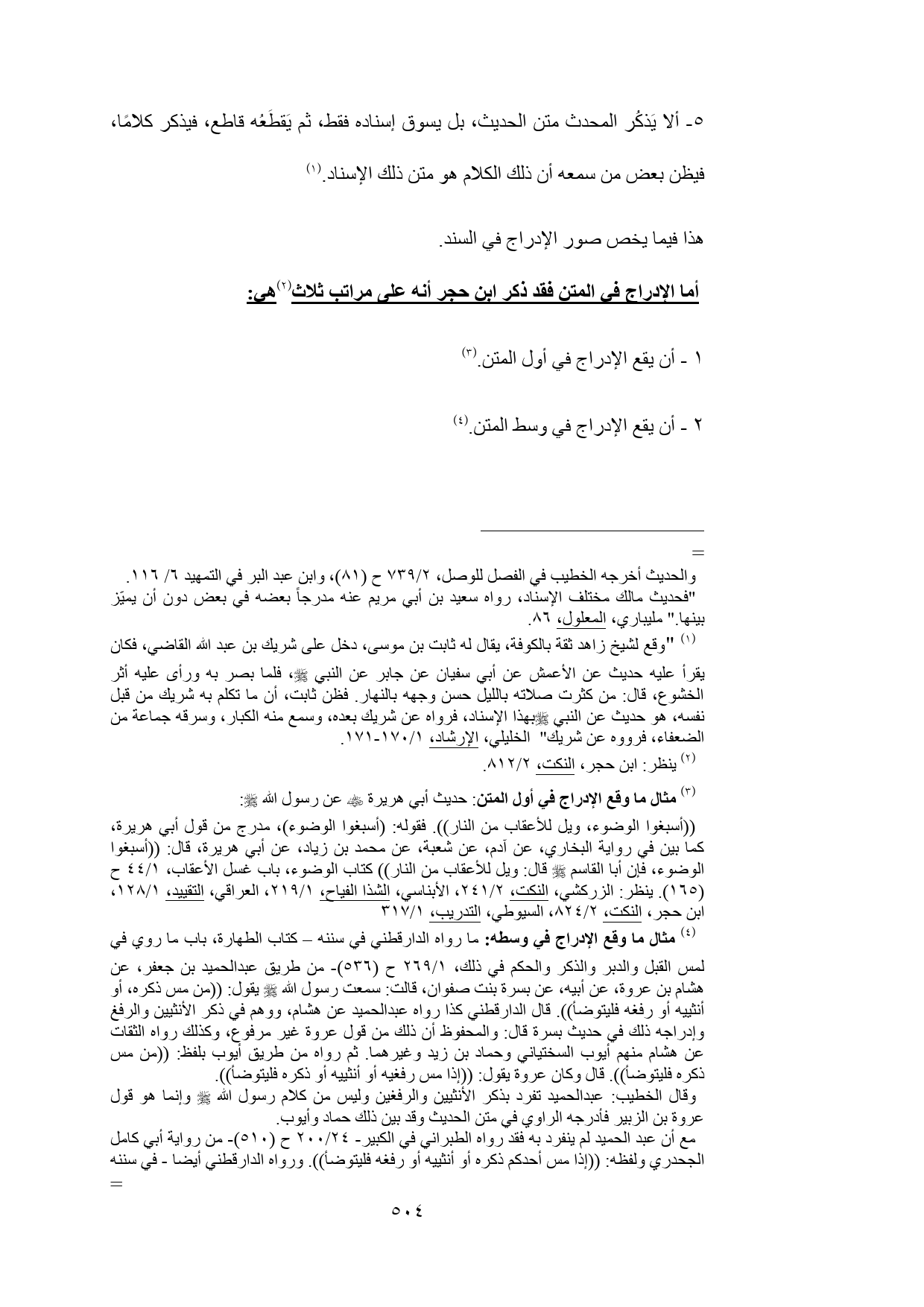 (¬4) مثال ما وقع الإدراج في وسطه: ما رواه الدارقطني في سننه - كتاب الطهارة، باب ما روي في لمس القبل والدبر والذكر والحكم في ذلك، 1/ 269 ح (536) - من طريق عبدالحميد بن جعفر، عن هشام بن عروة، عن أبيه، عن بسرة بنت صفوان، قالت: سمعت رسول الله - صلى الله عليه وسلم - يقول: ((من مس ذكره، أو أنثييه أو رفغه فليتوضأ)). قال الدارقطني كذا رواه عبدالحميد عن هشام، ووهم في ذكر الأنثيين والرفغ وإدراجه ذلك في حديث بسرة قال: والمحفوظ أن ذلك من قول عروة غير مرفوع، وكذلك رواه الثقات عن هشام منهم أيوب السختياني وحماد بن زيد وغيرهما. ثم رواه من طريق أيوب بلفظ: ((من مس ذكره فليتوضأ)). قال وكان عروة يقول: ((إذا مس رفغيه أو أنثييه أو ذكره فليتوضأ)).