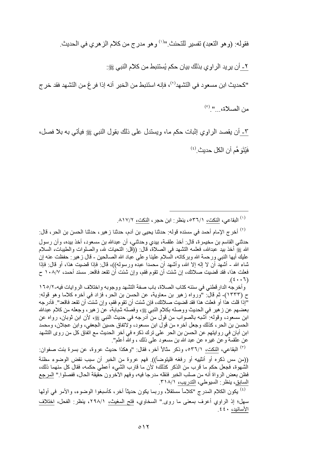 (¬4) يكون الكلام المدرج "كلاماً مستقلاً، وربما يكون حديثاً آخر، كأسبغوا الوضوء، والأمر في أولها سهل; إذ الراوي أعرف بمعنى ما روى." السخاوي، فتح المغيث، 1/ 298، ينظر: الفحل، اختلاف الأسانيد، 440.
