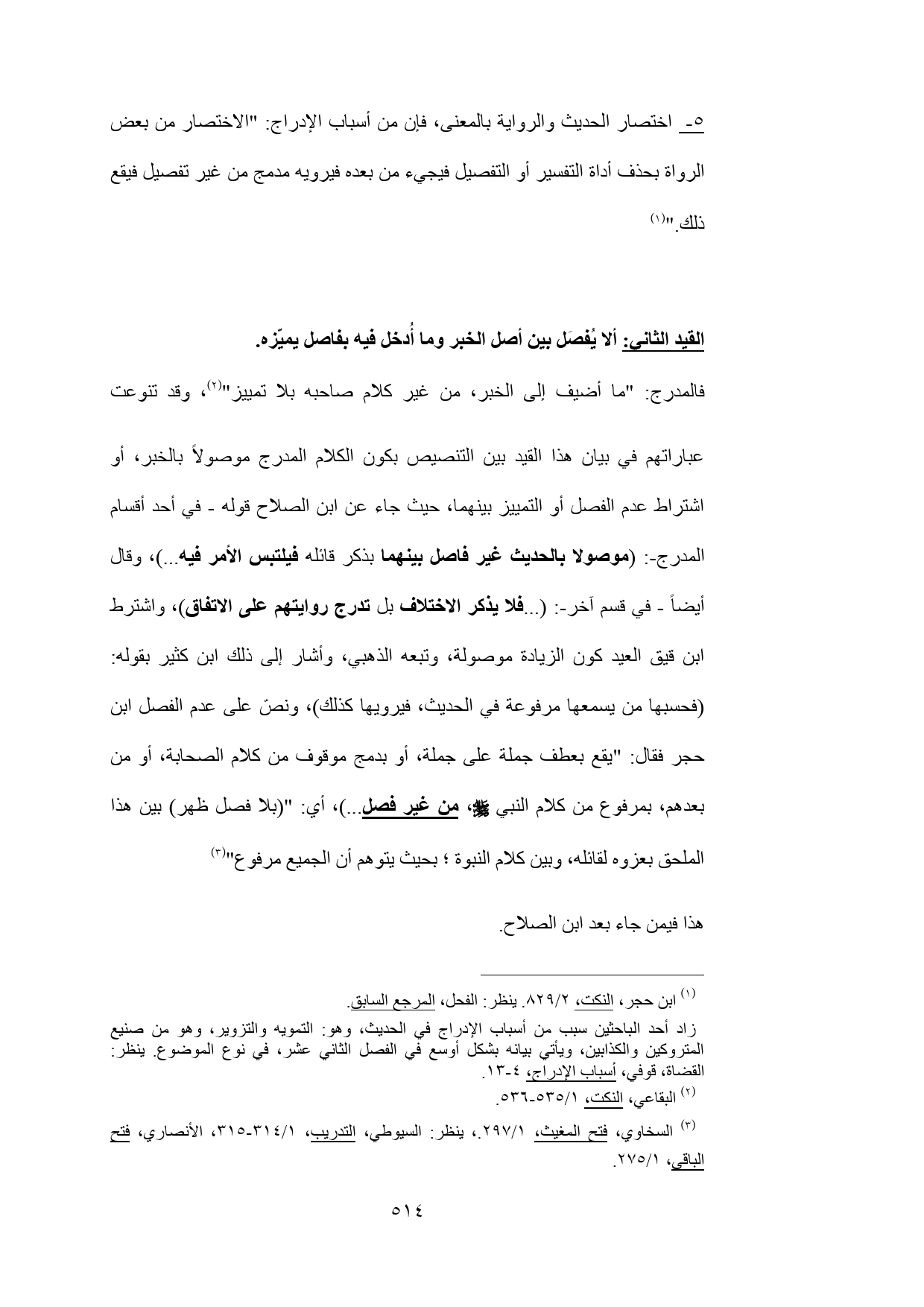 فالمدرج: "ما أضيف إلى الخبر، من غير كلام صاحبه بلا تمييز" (¬2)، وقد تنوعت عباراتهم في بيان هذا القيد بين التنصيص بكون الكلام المدرج موصولاً بالخبر، أو اشتراط عدم الفصل أو التمييز بينهما، حيث جاء عن ابن الصلاح قوله - في أحد أقسام المدرج-: (موصولا بالحديث غير فاصل بينهما بذكر قائله فيلتبس الأمر فيه ... )، وقال أيضاً - في قسم آخر-: ( ... فلا يذكر الاختلاف بل تدرج روايتهم على الاتفاق)، واشترط ابن قيق العيد كون الزيادة موصولة، وتبعه الذهبي، وأشار إلى ذلك ابن كثير بقوله: (فحسبها من يسمعها مرفوعة في الحديث، فيرويها كذلك)، ونصّ على عدم الفصل ابن حجر فقال: "يقع بعطف جملة على جملة، أو بدمج موقوف من كلام الصحابة، أو من بعدهم، بمرفوع من كلام النبي - صلى الله عليه وسلم -، من غير فصل ... )، أي: " (بلا فصل ظهر) بين هذا الملحق بعزوه لقائله، وبين كلام النبوة ; بحيث يتوهم أن الجميع مرفوع" (¬3)