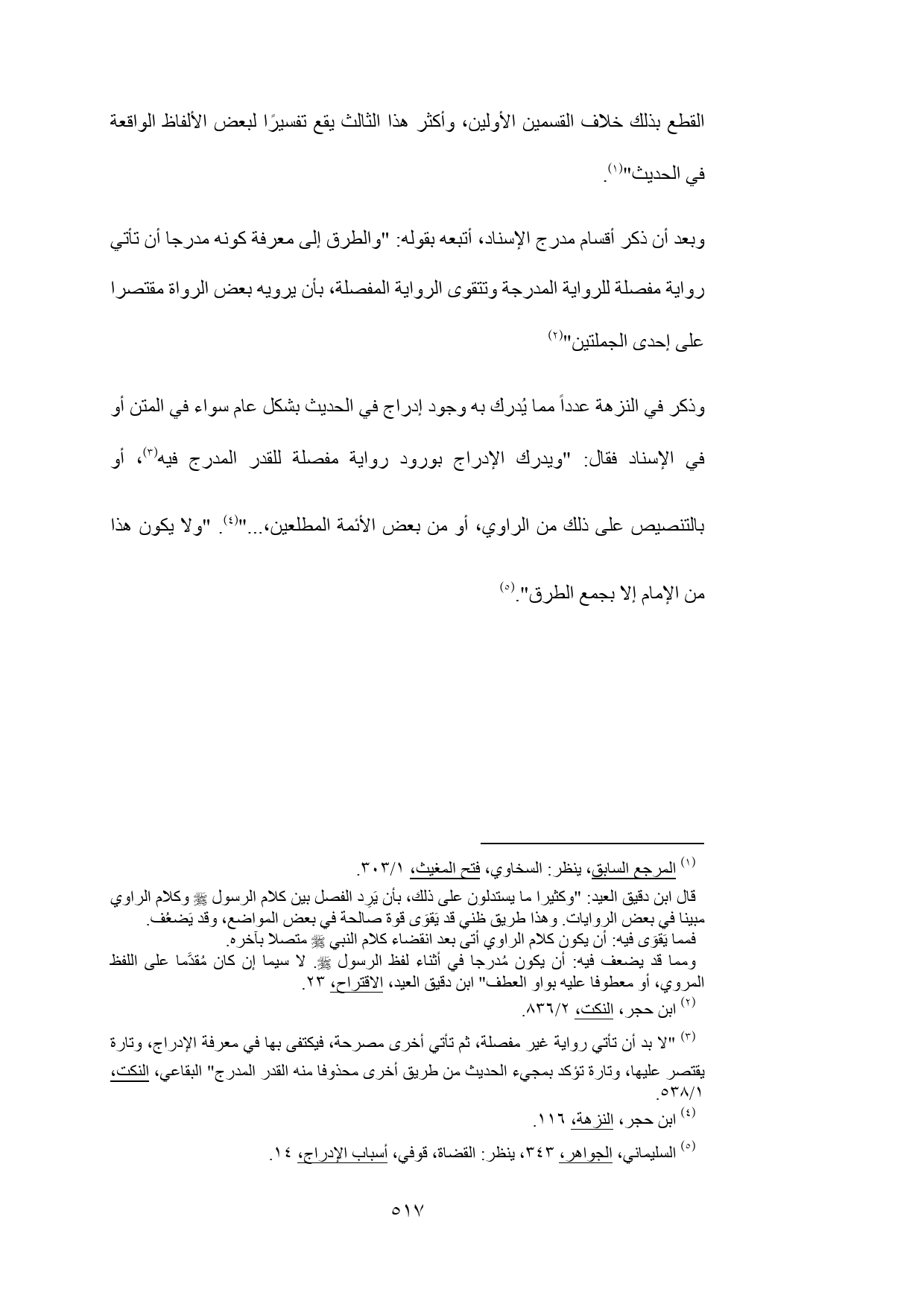 (¬3) "لا بد أن تأتي رواية غير مفصلة، ثم تأتي أخرى مصرحة، فيكتفى بها في معرفة الإدراج، وتارة يقتصر عليها، وتارة تؤكد بمجيء الحديث من طريق أخرى محذوفا منه القدر المدرج" البقاعي، النكت، 1/ 538.